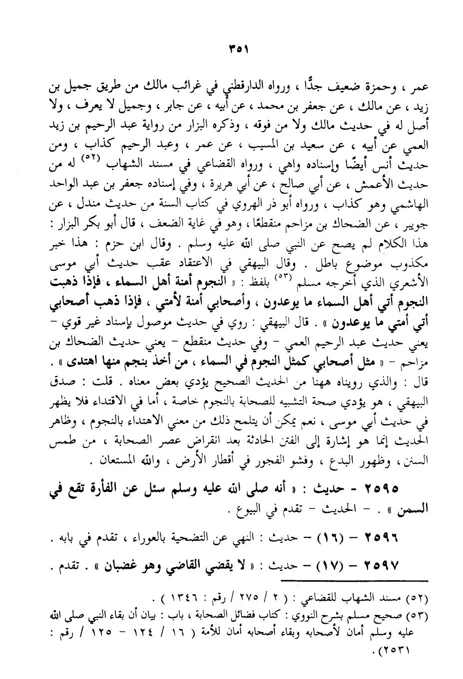 وَحَمْزَةُ ضَعِيفٌ جِدًّا، وَرَوَاهُ الدَّارَقُطْنِيُّ فِي غَرَائِبِ مَالِكٍ مِنْ طَرِيقِ جَمِيلِ بْنِ زَيْدٍ، عَنْ مَالِكٍ، عَنْ جَعْفَرِ بْنِ مُحَمَّدٍ، عَنْ أَبِيهِ، عَنْ جَابِرٍ، وَجَمِيلٌ لَا يُعْرَفُ، وَلَا أَصْلَ لَهُ فِي حَدِيثِ مَالِكٍ وَلَا مَنْ فَوْقَهُ، وَذَكَرَهُ الْبَزَّارُ مِنْ رِوَايَةِ عَبْدِ الرَّحِيمِ بْنِ زَيْدٍ الْعَمِّيِّ عَنْ أَبِيهِ، عَنْ سَعِيدِ بْنِ الْمُسَيِّبِ، عَنْ عُمَرَ، وَعَبْدُ الرَّحِيمِ كَذَّابٌ، وَمِنْ حَدِيثِ أَنَسٍ أَيْضًا وَإِسْنَادُهُ وَاهٍ، وَرَوَاهُ الْقُضَاعِيُّ فِي مُسْنَدِ الشِّهَابِ لَهُ مِنْ حَدِيثِ الْأَعْمَشِ، عَنْ أَبِي صَالِحٍ، عَنْ أَبِي هُرَيْرَةَ، وَفِي إسْنَادِهِ جَعْفَرُ بْنُ عَبْدُ الْوَاحِدِ الْهَاشِمِيُّ وَهُوَ كَذَّابٌ، وَرَوَاهُ أَبُو ذَرٍّ الْهَرَوِيُّ فِي كِتَابِ السُّنَّةِ مِنْ حَدِيثِ مِنْدَلٍ، عَنْ جُوَيْبِرٍ، عَنْ الضَّحَّاكِ بْنِ مُزَاحِمٍ مُنْقَطِعًا، وَهُوَ فِي غَايَةِ الضَّعْفِ، قَالَ أَبُو بَكْرٍ الْبَزَّارُ: هَذَا الْكَلَامُ لَمْ يَصِحَّ عَنْ النَّبِيِّ - صَلَّى اللَّهُ عَلَيْهِ وَسَلَّمَ -. وَقَالَ ابْنُ حَزْمٍ: هَذَا خَبَرٌ مَكْذُوبٌ مَوْضُوعٌ بَاطِلٌ. وَقَالَ الْبَيْهَقِيُّ فِي الِاعْتِقَادِ عَقِبَ حَدِيثِ أَبِي مُوسَى الْأَشْعَرِيِّ الَّذِي أَخْرَجَهُ مُسْلِمٌ بِلَفْظِ: «النُّجُومُ أَمَنَةُ أَهْلِ السَّمَاءِ، فَإِذَا ذَهَبَتْ النُّجُومُ أُتِيَ أَهْلُ السَّمَاءِ مَا يُوعَدُونَ، وَأَصْحَابِي أَمَنَةٌ لِأُمَّتِي، فَإِذَا ذَهَبَ أَصْحَابِي أُتِيَ أُمَّتِي مَا يُوعَدُونَ» . قَالَ الْبَيْهَقِيُّ: رُوِيَ فِي حَدِيثٍ مَوْصُولٍ بِإِسْنَادٍ غَيْرِ قَوِيٍّ - يَعْنِي حَدِيثَ عَبْدِ الرَّحِيمِ الْعَمِّيِّ - وَفِي حَدِيثٍ مُنْقَطِعٍ - يَعْنِي حَدِيثَ الضَّحَّاكِ ابْنِ مُزَاحِمٍ - «مَثَلُ أَصْحَابِي كَمَثَلِ النُّجُومِ فِي السَّمَاءِ، مَنْ أَخَذَ بِنَجْمٍ مِنْهَا اهْتَدَى» . قَالَ: وَاَلَّذِي رَوَيْنَاهُ هَا هُنَا مِنْ الْحَدِيثِ الصَّحِيحِ يُؤَدِّي بَعْضَ مَعْنَاهُ. قُلْت: صَدَقَ الْبَيْهَقِيُّ، هُوَ يُؤَدِّي صِحَّةَ التَّشْبِيهِ لِلصَّحَابَةِ بِالنُّجُومِ خَاصَّةً، أَمَّا فِي الِاقْتِدَاءِ فَلَا يَظْهَرُ فِي حَدِيثِ أَبِي مُوسَى، نَعَمْ يُمْكِنُ أَنْ يَتَلَمَّحَ ذَلِكَ مِنْ مَعْنَى الِاهْتِدَاءِ بِالنُّجُومِ، وَظَاهِرُ الْحَدِيثِ إنَّمَا هُوَ إشَارَةٌ إلَى الْفِتَنِ الْحَادِثَةِ بَعْدَ انْقِرَاضِ عَصْرِ الصَّحَابَةِ، مِنْ طَمْسِ السُّنَنِ، وَظُهُورِ الْبِدَعِ، وَفُشُوِّ الْفُجُورِ فِي أَقْطَارِ الْأَرْضِ، وَاَللَّهُ الْمُسْتَعَانُ.