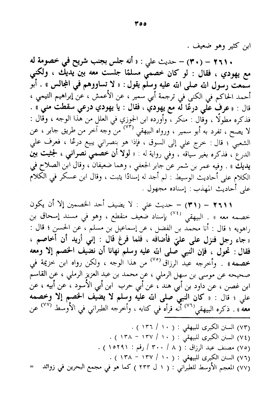 2611 - (31) - حَدِيثُ عَلِيٍّ: لَا يُضَيَّفُ أَحَدُ الْخَصْمَيْنِ إلَّا أَنْ يَكُونَ خَصْمُهُ مَعَهُ ". الْبَيْهَقِيُّ بِإِسْنَادٍ ضَعِيفٍ مُنْقَطِعٍ، وَهُوَ فِي مُسْنَدِ إِسْحَاقَ بْنِ رَاهْوَيْهِ؛ قَالَ: أَنَا مُحَمَّدُ بْنُ الْفَضْلِ، عَنْ إسْمَاعِيلَ بْنِ مُسْلِمٍ، عَنْ الْحَسَنِ؛ قَالَ: " جَاءَ رَجُلٌ فَنَزَلَ عَلَى عَلِيٍّ فَأَضَافَهُ، فَلَمَّا فَرَغَ قَالَ: إنِّي أُرِيدُ أَنْ أُخَاصِمَ، فَقَالَ: تَحَوَّلْ، فَإِنَّ النَّبِيَّ - صَلَّى اللَّهُ عَلَيْهِ وَسَلَّمَ - نَهَانَا أَنْ نُضَيِّفَ الْخَصْمَ إلَّا وَمَعَهُ خَصْمُهُ ". وَأَخْرَجَهُ عَبْدُ الرَّزَّاقِ مِنْ هَذَا الْوَجْهِ، وَلَكِنْ رَوَاهُ ابْنُ خُزَيْمَةَ فِي صَحِيحِهِ عَنْ مُوسَى بْنِ سَهْلٍ الرَّمْلِيِّ، عَنْ مُحَمَّدِ بْنِ عَبْدِ الْعَزِيزِ الرَّمْلِيِّ، عَنْ الْقَاسِمِ بْنِ غُصْنٍ، عَنْ دَاوُد بْنِ أَبِي هِنْدٍ، عَنْ أَبِي حَرْبٍ بْنِ أَبِي الْأَسْوَدِ، عَنْ أَبِيهِ، عَنْ عَلِيٍّ؛ قَالَ: «كَانَ النَّبِيُّ - صَلَّى اللَّهُ عَلَيْهِ وَسَلَّمَ - لَا يُضَيِّفُ الْخَصْمَ إلَّا وَخَصْمُهُ مَعَهُ» . ذَكَرَهُ الْبَيْهَقِيُّ أَنَّهُ قَرَأَهُ فِي كِتَابِهِ، وَأَخْرَجَهُ الطَّبَرَانِيُّ فِي الْأَوْسَطِ عَنْ