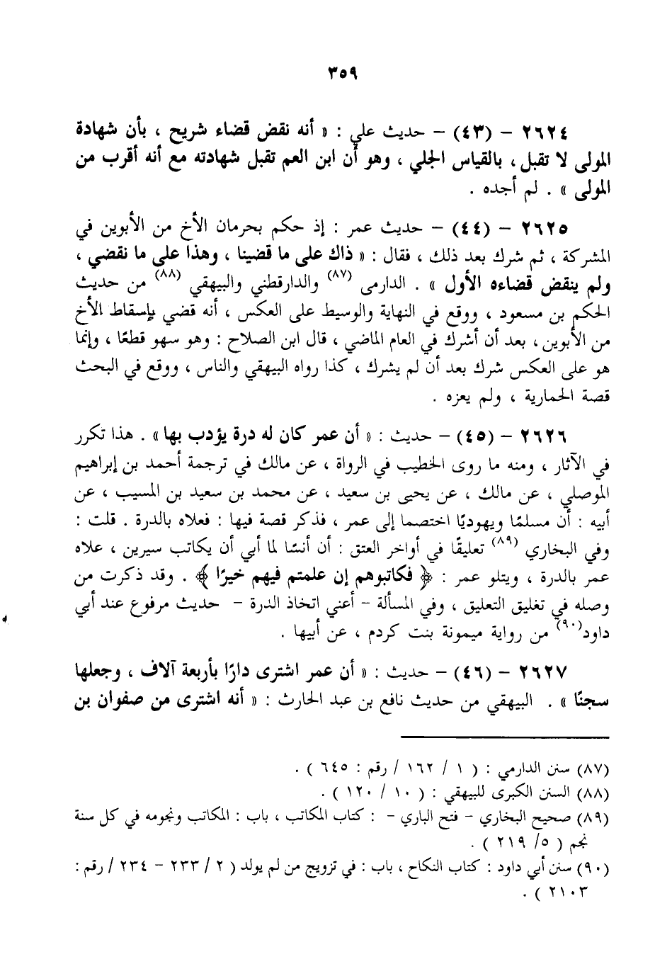2625 - (44) - حَدِيثُ عُمَرَ: إذْ حَكَمَ بِحِرْمَانِ الْأَخِ مِنْ الْأَبَوَيْنِ فِي الْمُشَرَّكَةِ، ثُمَّ شَرَّكَ بَعْدَ ذَلِكَ، فَقَالَ: " ذَاكَ عَلَى مَا قَضَيْنَا، وَهَذَا عَلَى مَا نَقْضِي، وَلَمْ يَنْقُضْ قَضَاءَهُ الْأَوَّلَ ". الدَّارِمِيُّ وَالدَّارَقُطْنِيّ وَالْبَيْهَقِيُّ مِنْ حَدِيثِ الْحَكَمِ بْنِ مَسْعُودٍ، وَوَقَعَ فِي النِّهَايَةِ وَالْوَسِيطِ عَلَى الْعَكْسِ، أَنَّهُ قَضَى بِإِسْقَاطِ الْأَخِ مِنْ الْأَبَوَيْنِ، بَعْدَ أَنْ أَشْرَكَ فِي الْعَامِ الْمَاضِي، قَالَ ابْنُ الصَّلَاحِ: وَهُوَ سَهْوٌ قَطْعًا، وَإِنَّمَا هُوَ عَلَى الْعَكْسِ شَرَّك بَعْدَ أَنْ لَمْ يُشَرِّكْ، كَذَا رَوَاهُ الْبَيْهَقِيُّ وَالنَّاسُ، وَوَقَعَ فِي الْبَحْثِ قِصَّةُ الْحِمَارِيَّةِ، وَلَمْ يَعْزُهُ.