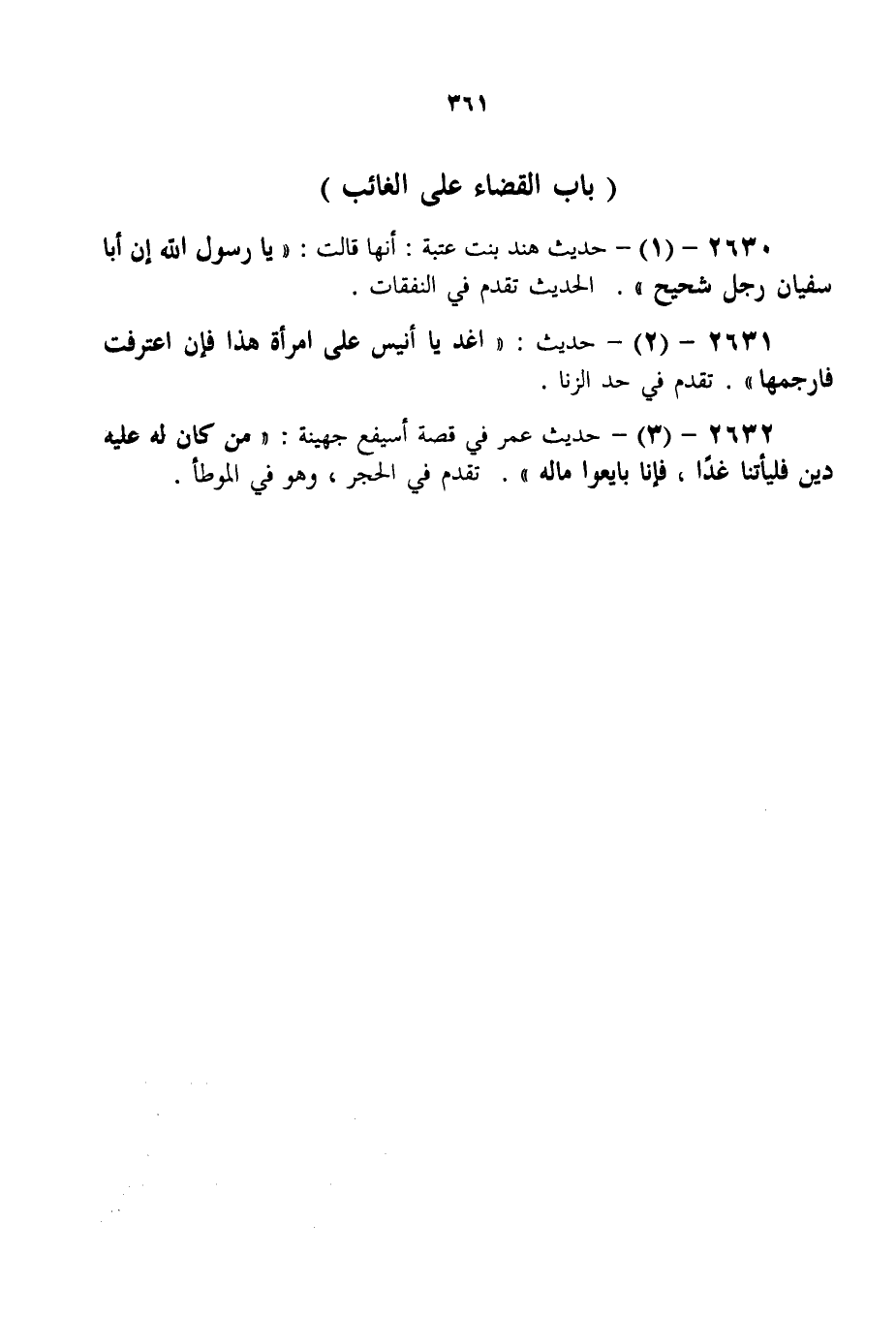 2631 - (2) - حَدِيثُ: «اُغْدُ يَا أُنَيْسُ عَلَى امْرَأَةِ هَذَا فَإِنْ اعْتَرَفَتْ فَارْجُمْهَا» . تَقَدَّمَ فِي حَدِّ الزِّنَا.