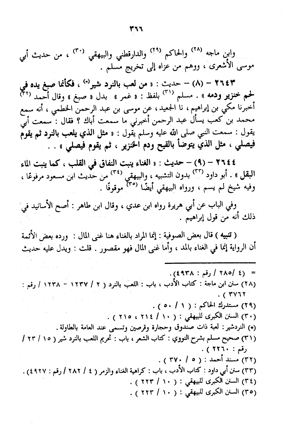 2644 - (9) - حَدِيثُ: «الْغِنَاءُ يُنْبِتُ النِّفَاقَ فِي الْقَلْبِ، كَمَا يُنْبِتُ الْمَاءُ الْبَقْلَ» أَبُو دَاوُد بِدُونِ التَّشْبِيهِ، وَالْبَيْهَقِيُّ مِنْ حَدِيثِ ابْنِ مَسْعُودٍ مَرْفُوعًا، وَفِيهِ شَيْخٌ لَمْ يُسَمَّ، وَرَوَاهُ الْبَيْهَقِيُّ أَيْضًا مَوْقُوفًا. وَفِي الْبَابِ عَنْ أَبِي هُرَيْرَةَ رَوَاهُ ابْنُ عَدِيٍّ، وَقَالَ ابْنُ طَاهِرٍ: أَصَحُّ الْأَسَانِيدِ فِي ذَلِكَ أَنَّهُ مِنْ قَوْلِ إبْرَاهِيمَ