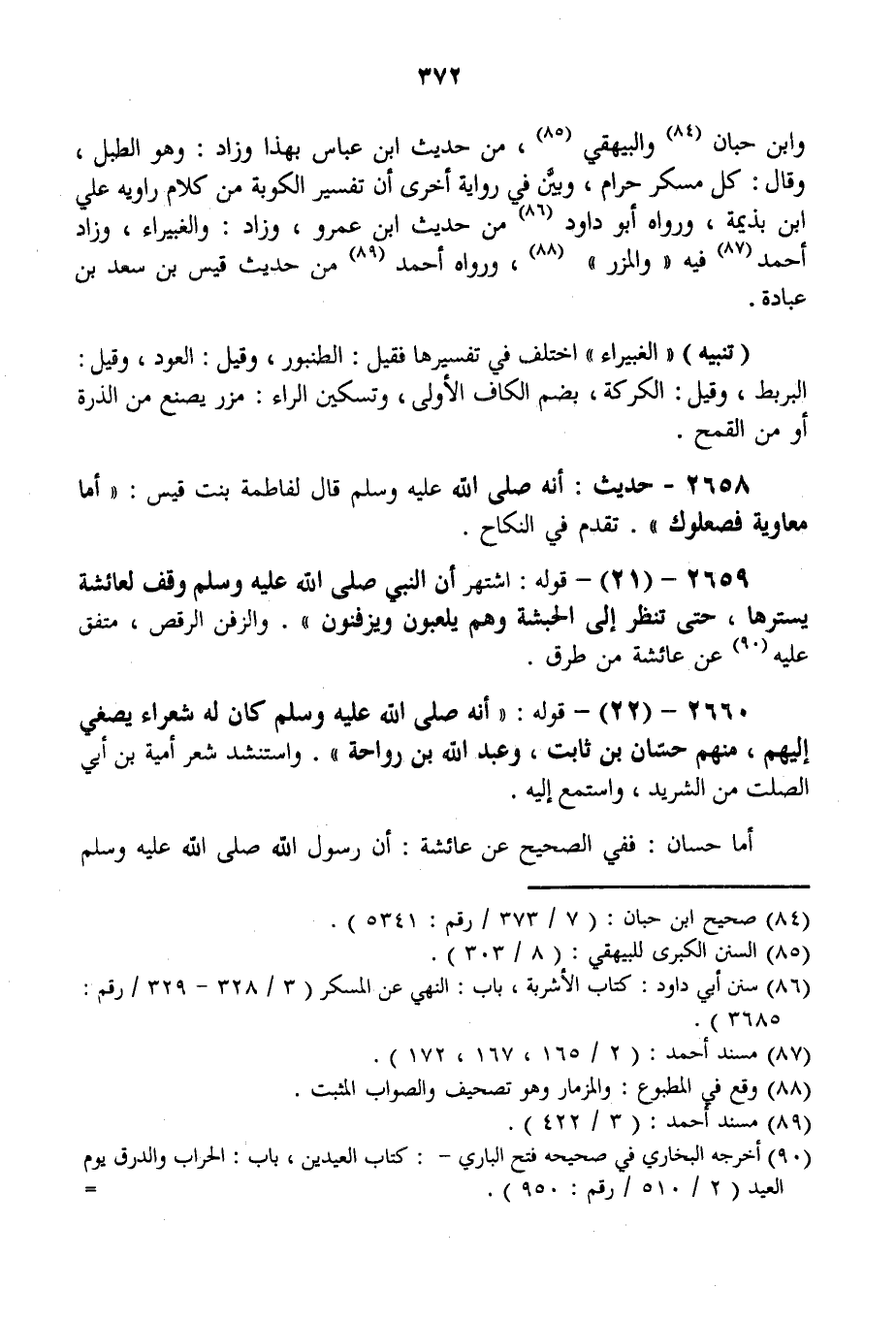 2659 - (21) - قَوْلُهُ: اُشْتُهِرَ «أَنَّ النَّبِيَّ - صَلَّى اللَّهُ عَلَيْهِ وَسَلَّمَ - وَقَفَ لِعَائِشَةَ يَسْتُرُهَا، حَتَّى تَنْظُرَ إلَى الْحَبَشَةِ وَهُمْ يَلْعَبُونَ وَيَزْفِنُونَ» وَالزَّفْنُ الرَّقْصُ، مُتَّفَقٌ عَلَيْهِ عَنْ عَائِشَةَ مِنْ طُرُقٍ