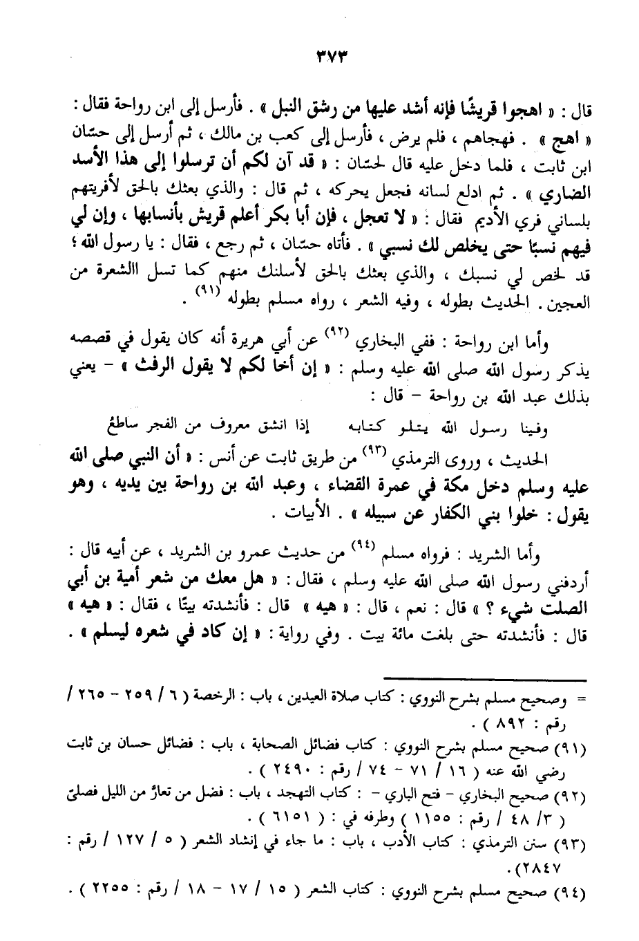 قَالَ: اُهْجُوا قُرَيْشًا فَإِنَّهُ أَشَدُّ عَلَيْهَا مِنْ رَشْقِ النَّبْلِ. فَأَرْسَلَ إلَى ابْنِ رَوَاحَةَ فَقَالَ: اُهْجُ. فَهَجَاهُمْ، فَلَمْ - يَرْضَ، فَأَرْسَلَ إلَى كَعْبِ بْنِ مَالِكٍ، ثُمَّ أَرْسَلَ إلَى حَسَّانِ بْنِ ثَابِتٍ، فَلَمَّا دَخَلَ عَلَيْهِ قَالَ لِحَسَّانَ: قَدْ آنَ لَكُمْ أَنْ تُرْسِلُوا إلَى هَذَا الْأَسَدِ الضَّارِي. ثُمَّ أَدْلَعَ لِسَانَهُ فَجَعَلَ يُحَرِّكُهُ، ثُمَّ قَالَ: وَاَلَّذِي بَعَثَك بِالْحَقِّ لَأَفْرِيَنَّهُمْ بِلِسَانِي فَرْيَ الْأَدِيمِ فَقَالَ: لَا تَعْجَلْ، فَإِنَّ أَبَا بَكْرٍ أَعْلَمُ قُرَيْشٍ بِأَنْسَابِهَا، وَإِنَّ لِي فِيهِمْ نَسَبًا حَتَّى يَخْلُصَ لَك نَسَبِي. فَأَتَاهُ حَسَّانُ، ثُمَّ رَجَعَ، فَقَالَ: يَا رَسُولَ اللَّهِ؛ قَدْ لَخَّصَ لِي نَسَبَكَ، وَاَلَّذِي بَعَثَكَ بِالْحَقِّ لَأَسُلَّنَّكَ مِنْهُمْ كَمَا تُسَلُّ الشَّعْرَةُ مِنْ الْعَجِينِ» الْحَدِيثُ بِطُولِهِ، وَفِيهِ الشِّعْرُ، رَوَاهُ مُسْلِمٌ بِطُولِهِ
