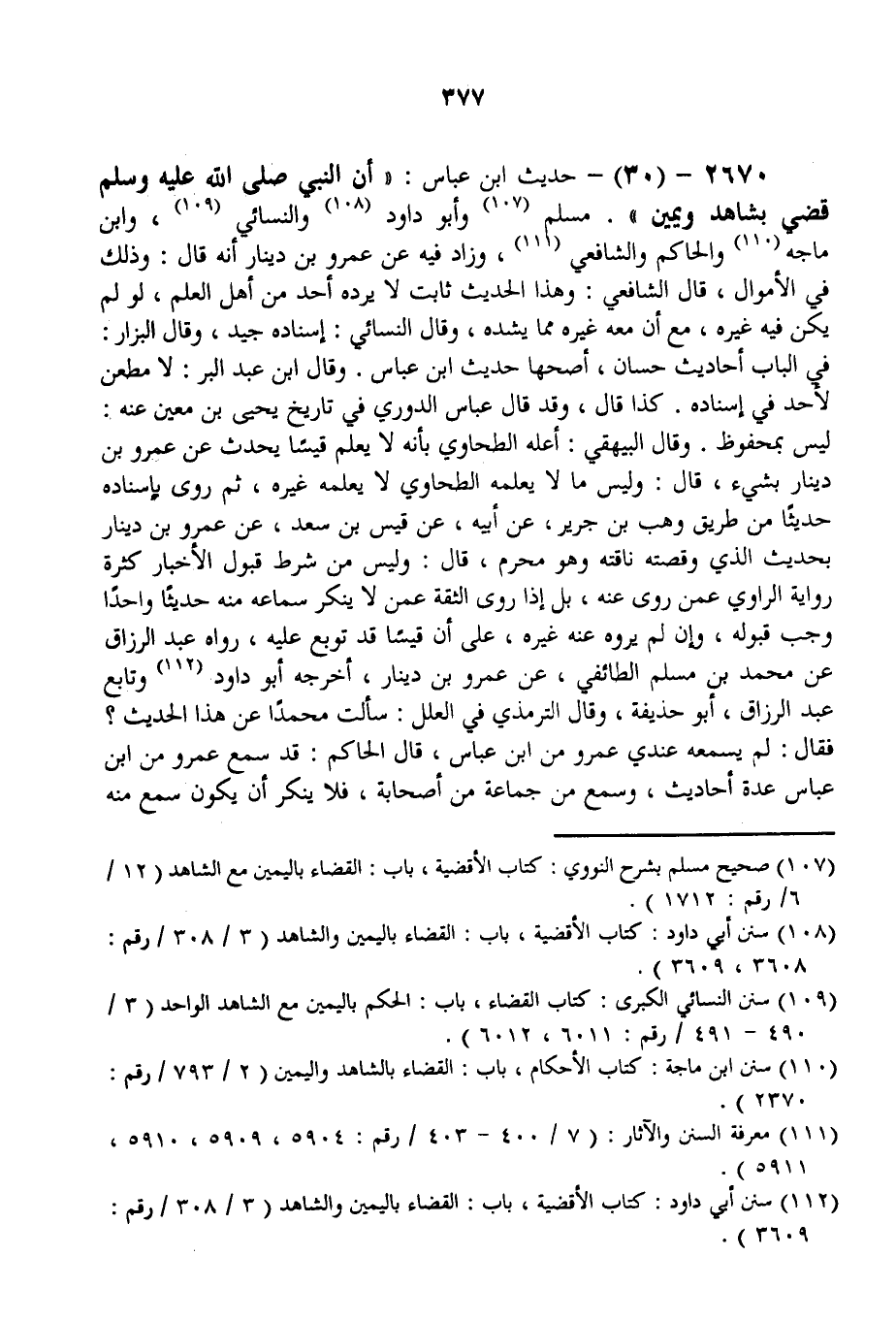 حَدِيثُ ابْنِ عَبَّاسٍ: «أَنَّ النَّبِيَّ - صَلَّى اللَّهُ عَلَيْهِ وَسَلَّمَ - قَضَى بِشَاهِدٍ وَيَمِينٍ» . مُسْلِمٌ وَأَبُو دَاوُد وَالنَّسَائِيُّ، وَابْنُ مَاجَهْ وَالْحَاكِمُ وَالشَّافِعِيُّ، وَزَادَ فِيهِ عَنْ عَمْرِو بْنِ دِينَارٍ أَنَّهُ قَالَ: وَذَلِكَ فِي الْأَمْوَالِ، قَالَ الشَّافِعِيُّ: وَهَذَا الْحَدِيثُ ثَابِتٌ لَا يَرُدُّهُ أَحَدٌ مِنْ أَهْلِ الْعِلْمِ، لَوْ لَمْ يَكُنْ فِيهِ غَيْرُهُ، مَعَ أَنَّ مَعَهُ غَيْرَهُ مِمَّا يَشُدُّهُ، وَقَالَ النَّسَائِيُّ: إسْنَادُهُ جَيِّدٌ، وَقَالَ الْبَزَّارُ: فِي الْبَابِ أَحَادِيثُ حِسَانٌ، أَصَحُّهَا حَدِيثُ ابْنِ عَبَّاسٍ.