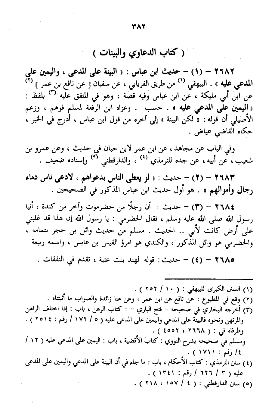 2682 - (1) - حَدِيثُ ابْنِ عَبَّاسٍ: «الْبَيِّنَةُ عَلَى الْمُدَّعِي، وَالْيَمِينُ عَلَى الْمُدَّعَى عَلَيْهِ» الْبَيْهَقِيُّ مِنْ طَرِيقِ الْفِرْيَابِيِّ، عَنْ سُفْيَانَ [عَنْ نَافِعِ بْنِ عُمَرَ] عَنْ ابْنِ أَبِي مُلَيْكَةَ، عَنْ ابْنِ عَبَّاسٍ وَفِيهِ قِصَّةٌ، وَهُوَ فِي الْمُتَّفَقِ عَلَيْهِ بِلَفْظِ: «الْيَمِينُ عَلَى الْمُدَّعَى عَلَيْهِ» حَسْبُ. وَعَزَاهُ ابْنُ الرِّفْعَةِ لِمُسْلِمٍ فَوَهِمَ، وَزَعَمَ الْأَصِيلِيُّ أَنَّ قَوْلَهُ: " لَكِنَّ الْبَيِّنَةَ " إلَى آخِرِهِ مِنْ قَوْلِ ابْنِ عَبَّاسٍ، أُدْرِجَ فِي الْخَبَرِ، حَكَاهُ الْقَاضِي عِيَاضُ. وَفِي الْبَابِ عَنْ مُجَاهِدٍ، عَنْ ابْنِ عُمَرَ لِابْنِ حِبَّانَ فِي. حَدِيثٍ، وَعَنْ عَمْرِو بْنِ شُعَيْبِ، عَنْ أَبِيهِ، عَنْ جَدِّهِ لِلتِّرْمِذِيِّ، وَالدَّارَقُطْنِيّ وَإِسْنَادُهُ ضَعِيفٌ
