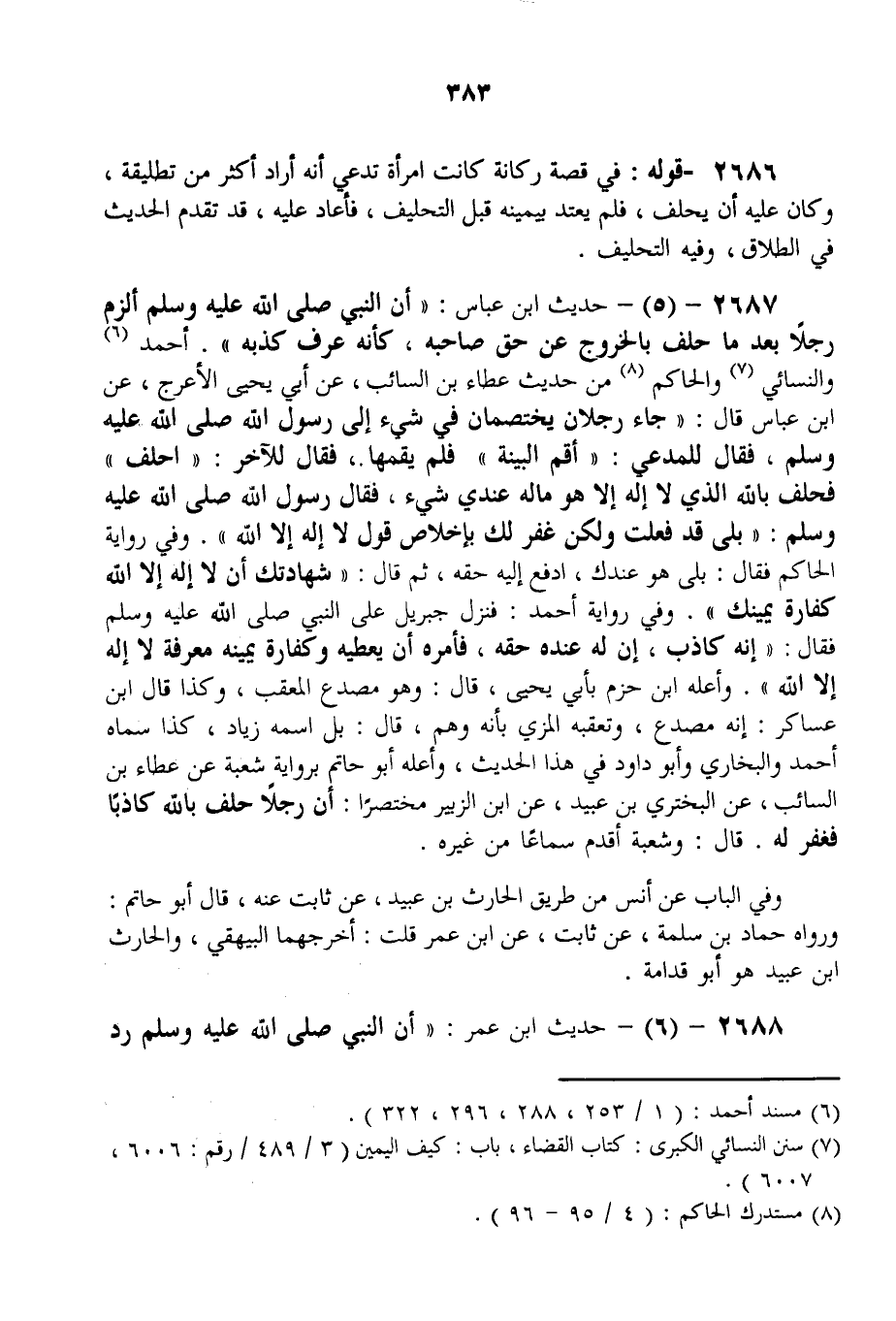 2687 - (5) - حَدِيثُ ابْنِ عَبَّاسٍ: «أَنَّ النَّبِيَّ - صَلَّى اللَّهُ عَلَيْهِ وَسَلَّمَ - أَلْزَمَ رَجُلًا بَعْدَ مَا حَلَفَ بِالْخُرُوجِ عَنْ حَقِّ صَاحِبِهِ، كَأَنَّهُ عَرَفَ كَذِبَهُ» أَحْمَدُ وَالنَّسَائِيُّ وَالْحَاكِمُ مِنْ حَدِيثِ عَطَاءِ بْنِ السَّائِبِ، عَنْ أَبِي يَحْيَى الْأَعْرَجِ، عَنْ ابْنِ عَبَّاسٍ قَالَ: «جَاءَ رَجُلَانِ يَخْتَصِمَانِ فِي شَيْءٍ إلَى رَسُولِ اللَّهِ - صَلَّى اللَّهُ عَلَيْهِ وَسَلَّمَ -، فَقَالَ لِلْمُدَّعِي: أَقِمْ الْبَيِّنَةَ فَلَمْ يُقِمْهَا، فَقَالَ لِلْآخَرِ: احْلِفْ فَحَلَفَ بِاَللَّهِ الَّذِي لَا إلَهَ إلَّا هُوَ مَا لَهُ عِنْدِي شَيْءٌ، فَقَالَ رَسُولُ اللَّهِ - صَلَّى اللَّهُ عَلَيْهِ وَسَلَّمَ -: بَلَى قَدْ فَعَلْت وَلَكِنْ غُفِرَ لَك بِإِخْلَاصِ قَوْلِ لَا إلَهِ إلَّا اللَّهُ» وَفِي رِوَايَةِ الْحَاكِمِ «فَقَالَ: بَلَى هُوَ عِنْدَك، ادْفَعْ إلَيْهِ حَقَّهُ، ثُمَّ قَالَ: شَهَادَتُك أَنْ لَا إلَهَ إلَّا اللَّهُ كَفَّارَةُ يَمِينِك» .