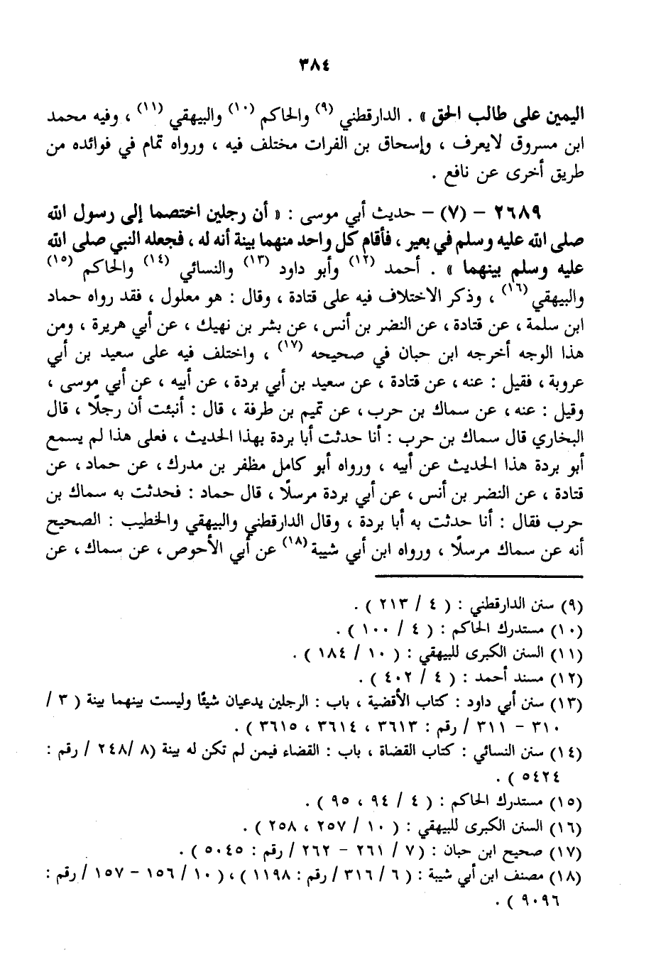 2689 - (7) - حَدِيثُ أَبِي مُوسَى: «أَنَّ رَجُلَيْنِ اخْتَصَمَا إلَى رَسُولِ اللَّهِ - صَلَّى اللَّهُ عَلَيْهِ وَسَلَّمَ - فِي بَعِيرٍ، فَأَقَامَ كُلُّ وَاحِدٍ مِنْهُمَا بَيِّنَةً أَنَّهُ لَهُ، فَجَعَلَهُ النَّبِيُّ - صَلَّى اللَّهُ عَلَيْهِ وَسَلَّمَ - بَيْنَهُمَا» أَحْمَدُ وَأَبُو دَاوُد وَالنَّسَائِيُّ وَالْحَاكِمُ وَالْبَيْهَقِيُّ، وَذَكَرَ الِاخْتِلَافَ فِيهِ عَلَى قَتَادَةَ، وَقَالَ: هُوَ مَعْلُولٌ، فَقَدْ رَوَاهُ حَمَّادُ بْنُ سَلَمَةَ، عَنْ قَتَادَةَ، عَنْ النَّضْرِ بْنِ أَنَسٍ، عَنْ بِشْرِ بْنِ نَهِيكٍ، عَنْ أَبِي هُرَيْرَةَ، وَمِنْ هَذَا الْوَجْهِ أَخْرَجَهُ ابْنُ حِبَّانَ فِي صَحِيحِهِ، وَاخْتُلِفَ فِيهِ عَلَى سَعِيدِ بْنِ أَبِي عَرُوبَةَ، فَقِيلَ: عَنْهُ، عَنْ قَتَادَةَ، عَنْ سَعِيدِ بْنِ أَبِي بُرْدَةَ، عَنْ أَبِيهِ، عَنْ أَبِي مُوسَى، وَقِيلَ: عَنْهُ، عَنْ سِمَاكِ بْنِ حَرْبٍ، عَنْ تَمِيمِ بْنِ طَرَفَةَ، قَالَ: أُنْبِئْت أَنَّ رَجُلًا، قَالَ الْبُخَارِيُّ قَالَ سِمَاكُ بْنُ حَرْبٍ: أَنَا حَدَّثْت أَبَا بُرْدَةَ بِهَذَا الْحَدِيثِ، فَعَلَى هَذَا لَمْ يَسْمَعْ أَبُو بُرْدَةَ هَذَا الْحَدِيثَ مِنْ أَبِيهِ، وَرَوَاهُ أَبُو كَامِلٍ، مُظَفَّرُ بْنُ مُدْرِكٍ، عَنْ حَمَّادٍ، عَنْ قَتَادَةَ، عَنْ النَّضْرِ بْنِ أَنَسٍ، عَنْ أَبِي بُرْدَةَ مُرْسَلًا، قَالَ حَمَّادٌ: فَحَدَّثْتُ بِهِ سِمَاكَ بْنَ حَرْبٍ فَقَالَ: أَنَا حَدَّثْت بِهِ أَبَا بُرْدَةَ، وَقَالَ الدَّارَقُطْنِيُّ وَالْبَيْهَقِيُّ وَالْخَطِيبُ: الصَّحِيحُ أَنَّهُ عَنْ سِمَاكٍ مُرْسَلًا وَرَوَاهُ ابْنُ أَبِي شَيْبَةَ عَنْ أَبِي الْأَحْوَصِ، عَنْ سِمَاكٍ، عَنْ