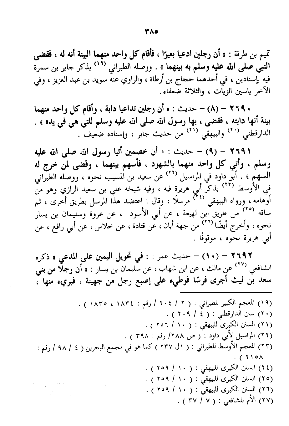 2690 - (8) - حَدِيثُ: «أَنَّ رَجُلَيْنِ تَدَاعَيَا دَابَّةً، وَأَقَامَ كُلُّ وَاحِدٍ مِنْهُمَا بَيِّنَةً أَنَّهَا دَابَّتُهُ، فَقَضَى، بِهَا رَسُولُ اللَّهِ - صَلَّى اللَّهُ عَلَيْهِ وَسَلَّمَ - لِلَّتِي هِيَ فِي يَدِهِ» الدَّارَقُطْنِيُّ وَالْبَيْهَقِيُّ مِنْ حَدِيثِ جَابِرٍ، وَإِسْنَادُهُ ضَعِيفٌ