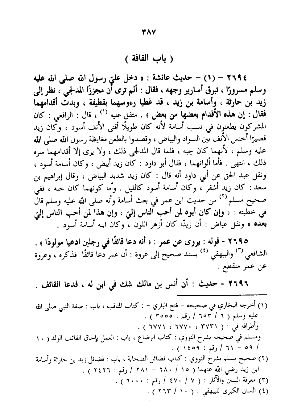 2694 - (1) - حَدِيثُ «عَائِشَةَ: دَخَلَ عَلَيَّ رَسُولُ اللَّهِ - صَلَّى اللَّهُ عَلَيْهِ وَسَلَّمَ - مَسْرُورًا، تَبْرُقُ أَسَارِيرُ وَجْهِهِ، فَقَالَ: أَلَمْ تَرَيْ أَنَّ مُجَزِّزًا الْمُدْلِجِيَّ، نَظَرَ إلَى زَيْدِ بْنِ حَارِثَةَ، وَأُسَامَةَ بْنِ زَيْدٍ، قَدْ غَطَّيَا رُءُوسَهُمَا بِقَطِيفَةٍ، وَبَدَتْ أَقْدَامُهُمَا فَقَالَ: إنَّ هَذِهِ الْأَقْدَامَ بَعْضُهَا مِنْ بَعْضِ» مُتَّفَقٌ عَلَيْهِ، قَالَ: الرَّافِعِيُّ: كَانَ الْمُشْرِكُونَ يَطْعَنُونَ فِي نَسَبِ أُسَامَةَ لِأَنَّهُ كَانَ طَوِيلًا أَقْنَى الْأَنْفَ أَسْوَدَ، وَكَانَ زَيْدٌ قَصِيرًا أَخْنَسَ الْأَنْفِ بَيْنَ السَّوَادِ وَالْبَيَاضِ، وَقَصَدُوا بِالطَّعْنِ مُغَايَظَةَ رَسُولِ اللَّهِ - صَلَّى اللَّهُ عَلَيْهِ وَسَلَّمَ -، لِأَنَّهُمَا كَانَا حِبَّهُ، فَلَمَّا قَالَ الْمُدْلِجِيُّ ذَلِكَ، وَلَا يَرَى إلَّا أَقْدَامَهُمَا سَرَّهُ ذَلِكَ، انْتَهَى. فَأَمَّا أَلْوَانُهُمَا، فَقَالَ أَبُو دَاوُد: كَانَ زَيْدٌ أَبْيَضَ، وَكَانَ أُسَامَةُ أَسْوَدَ، وَنَقَلَ عَبْدُ الْحَقِّ عَنْ أَبِي دَاوُد أَنَّهُ قَالَ: كَانَ زَيْدٌ شَدِيدَ الْبَيَاضِ، وَقَالَ إبْرَاهِيمُ بْنُ سَعْدٍ: كَانَ زَيْدٌ أَشْقَرَ، وَكَانَ أُسَامَةُ أَسْوَدَ كَاللَّيْلِ. وَأَمَّا كَوْنُهُمَا كَانَا حِبَّهُ، فَفِي صَحِيحِ مُسْلِمٍ مِنْ حَدِيثِ ابْنِ عُمَرَ فِي بَعْثِ أُسَامَةَ وَأَنَّهُ - صَلَّى اللَّهُ عَلَيْهِ وَسَلَّمَ - قَالَ فِي خُطْبَتِهِ: " وَإِنْ كَانَ أَبُوهُ لَمِنْ أَحَبِّ النَّاسِ إلَيَّ، وَإِنَّ هَذَا لَمِنْ أَحَبِّ النَّاسِ إلَيَّ بَعْدَهُ " وَنَقَلَ عِيَاضٌ: أَنَّ زَيْدًا كَانَ أَزْهَرَ اللَّوْنِ، وَكَانَ ابْنُهُ أُسَامَةُ أَسْوَدَ.