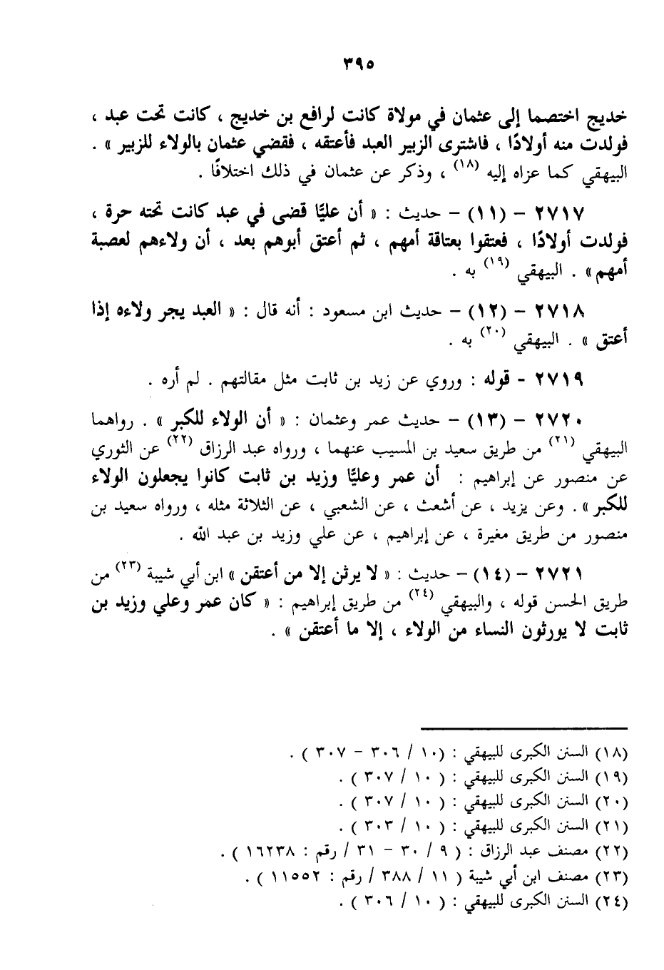 2720 - (13) - حَدِيثُ عُمَرَ وَعُثْمَانَ: " أَنَّ الْوَلَاءَ لِلْكِبَرِ " رَوَاهُمَا الْبَيْهَقِيُّ مِنْ طَرِيقِ سَعِيدِ بْنِ الْمُسَيِّبِ عَنْهُمَا وَرَوَاهُ عَبْدُ الرَّزَّاقِ عَنْ الثَّوْرِيِّ عَنْ مَنْصُورٍ عَنْ إبْرَاهِيمَ: أَنَّ عُمَرَ وَعَلِيًّا وَزَيْدَ بْنَ ثَابِتٍ كَانُوا يَجْعَلُونَ الْوَلَاءَ لِلْكِبَرِ ". وَعَنْ يَزِيدَ، عَنْ أَشْعَثَ، عَنْ الشَّعْبِيِّ، عَنْ الثَّلَاثَةِ مِثْلُهُ، وَرَوَاهُ سَعِيدُ بْنُ مَنْصُورٍ مِنْ طَرِيقِ مُغِيرَةَ، عَنْ إبْرَاهِيمَ، عَنْ عَلِيٍّ وَزَيْدِ بْنِ عَبْدِ اللَّهِ