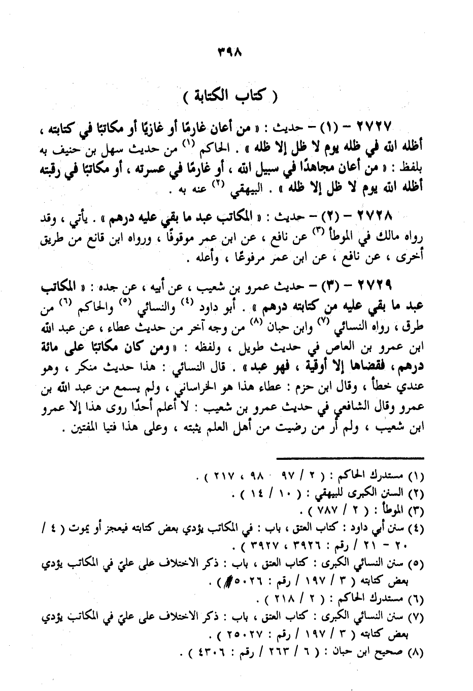 2729 - (3) - حَدِيثُ عَمْرِو بْنِ شُعَيْبٍ، عَنْ أَبِيهِ، عَنْ جَدِّهِ: «الْمُكَاتَبُ عَبْدٌ مَا بَقِيَ عَلَيْهِ مِنْ كِتَابَتِهِ دِرْهَمٌ» أَبُو دَاوُد وَالنَّسَائِيُّ وَالْحَاكِمُ مِنْ طُرُقٍ، رَوَاهُ النَّسَائِيُّ وَابْنُ حِبَّانَ مِنْ وَجْهٍ آخَرَ مِنْ حَدِيثِ عَطَاءٍ، عَنْ عَبْدِ اللَّهِ بْنِ عَمْرِو بْنِ الْعَاصِ فِي حَدِيثٍ طَوِيلٍ، وَلَفْظُهُ: «وَمَنْ كَانَ مُكَاتَبًا عَلَى مِائَةِ دِرْهَمٍ، فَقَضَاهَا إلَّا أُوقِيَّةً، فَهُوَ عَبْدٌ» . قَالَ النَّسَائِيُّ: هَذَا حَدِيثٌ مُنْكَرٌ، وَهُوَ عِنْدِي خَطَأٌ، وَقَالَ ابْنُ حَزْمٍ: عَطَاءٌ هَذَا هُوَ الْخُرَاسَانِيُّ، وَلَمْ يَسْمَعْ مِنْ عَبْدِ اللَّهِ بْنِ عَمْرِو وَقَالَ الشَّافِعِيُّ فِي حَدِيثِ عَمْرِو بْنِ شُعَيْبٍ: لَا أَعْلَمُ أَحَدًا رَوَى هَذَا إلَّا عَمْرَو بْنَ شُعَيْبٍ، وَلَمْ أَرَ مَنْ رَضِيتُ مِنْ أَهْلِ الْعِلْمِ يُثْبِتُهُ، وَعَلَى هَذَا فُتْيَا الْمُفْتِينَ.