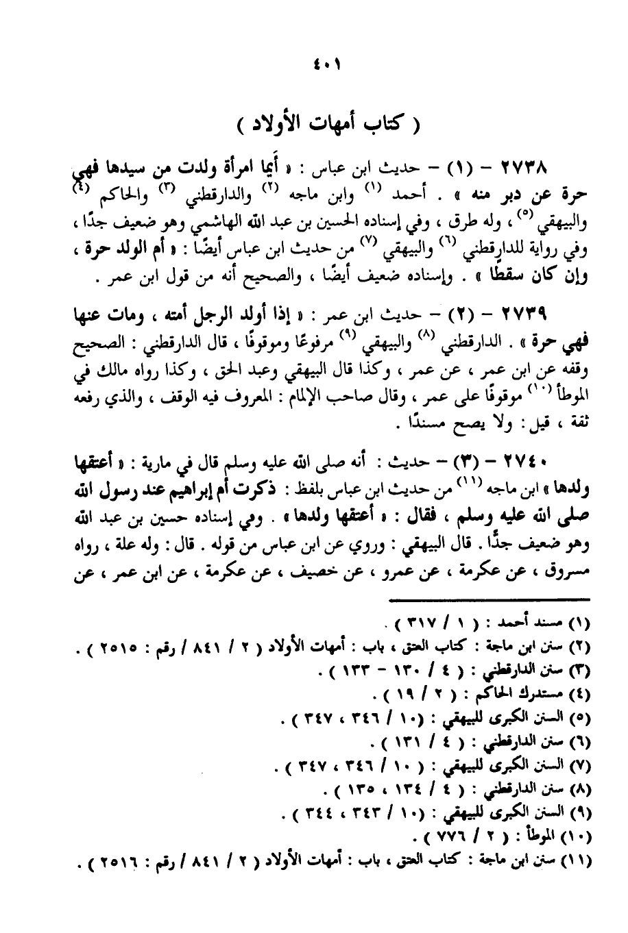 2738 - (1) - حَدِيثُ ابْنِ عَبَّاسٍ: " أَيُّمَا امْرَأَةٍ وَلَدَتْ مِنْ سَيِّدِهَا فَهِيَ حُرَّةٌ عَنْ دُبُرٍ مِنْهُ " أَحْمَدُ وَابْنُ مَاجَهْ وَالدَّارَقُطْنِيّ وَالْحَاكِمُ وَالْبَيْهَقِيُّ، وَلَهُ طُرُقٌ، وَفِي إسْنَادِهِ الْحُسَيْنُ بْنُ عَبْدِ اللَّهِ الْهَاشِمِيِّ وَهُوَ ضَعِيفٌ جِدًّا، وَفِي رِوَايَةٍ لِلدَّارَقُطْنِيِّ وَالْبَيْهَقِيِّ مِنْ حَدِيثِ ابْنِ عَبَّاسٍ أَيْضًا: " أُمُّ الْوَلَدِ حُرَّةٌ، وَإِنْ كَانَ سِقْطًا " وَإِسْنَادُهُ ضَعِيفٌ أَيْضًا، وَالصَّحِيحُ أَنَّهُ مِنْ قَوْلِ ابْنِ عُمَرَ