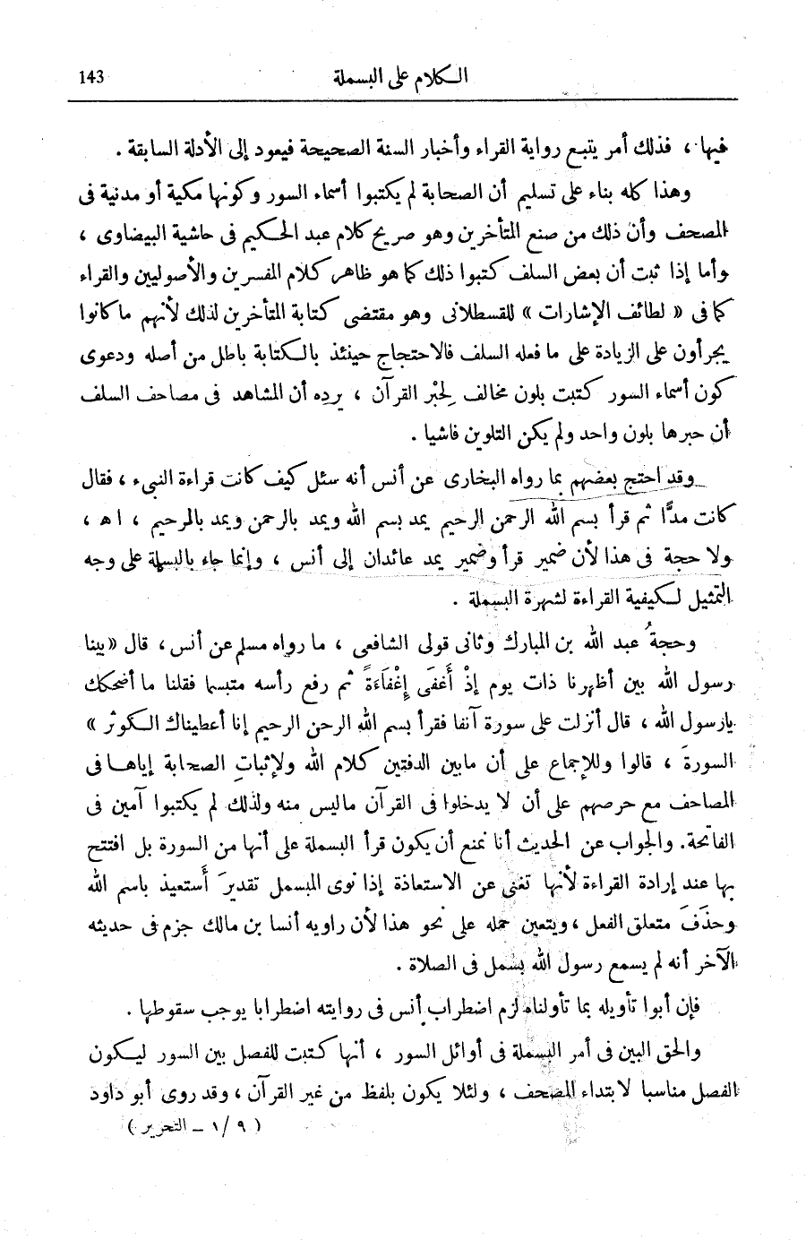 وَهَذَا كُلُّهُ بِنَاءً عَلَى تَسْلِيمِ أَنَّ الصَّحَابَةَ لَمْ يَكْتُبُوا أَسْمَاءَ السُّوَرِ وَكَوْنَهَا مَكِّيَّةً أَوْ مَدَنِيَّةً فِي الْمُصْحَفِ وَأَنَّ ذَلِكَ مِنْ صُنْعِ الْمُتَأَخِّرِينَ وَهُوَ صَرِيحُ كَلَامِ عَبْدِ الْحَكِيمِ فِي «حَاشِيَةِ الْبَيْضَاوِيِّ» ، وَأَمَّا إِذَا ثَبَتَ أَنَّ بَعْضَ السَّلَفِ كَتَبُوا ذَلِكَ كَمَا هُوَ ظَاهِرُ كَلَامِ الْمُفَسِّرِينَ وَالْأُصُولِيِّينَ وَالْقُرَّاءِ كَمَا فِي «لَطَائِفِ الْإِشَارَاتِ» لِلْقَسْطَلَانِيِّ وَهُوَ مُقْتَضَى كِتَابَةِ الْمُتَأَخِّرِينَ لِذَلِكَ لِأَنَّهُمْ مَا كَانُوا يجرأون عَلَى الزِّيَادَةِ عَلَى مَا فَعَلَهُ السَّلَفُ فَالِاحْتِجَاجُ حِينَئِذٍ بِالْكِتَابَةِ بَاطِلٌ مِنْ أَصْلِهِ وَدَعْوَى كَوْنِ أَسْمَاءِ السُّوَرِ كُتِبَتْ بِلَوْنٍ مُخَالِفٍ لِحِبْرِ الْقُرْآنِ، يَرُدُّهُ أَنَّ الْمُشَاهَدَ فِي مَصَاحِفِ السَّلَفِ أَنَّ حِبْرَهَا بِلَوْنٍ وَاحِدٍ وَلَمْ يَكُنِ التَّلْوِينُ فَاشِيًا.