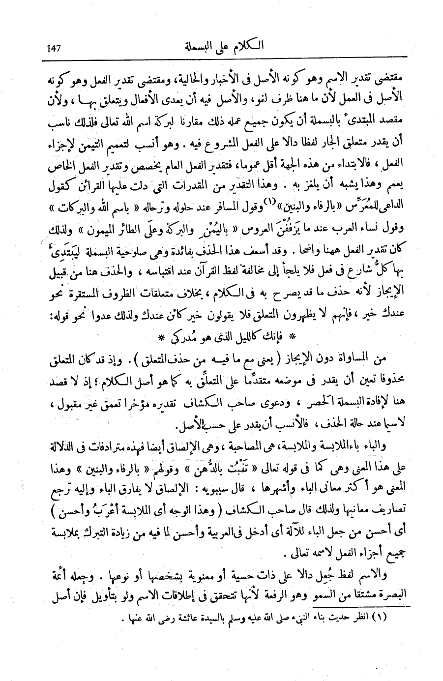مُتَعَلِّقُ الْجَارِّ لَفْظًا دَالًّا عَلَى الْفِعْلِ الْمَشْرُوعِ فِيهِ. وَهُوَ أَنْسَبُ لِتَعْمِيمِ التَّيَمُّنِ لِأَجْزَاءِ الْفِعْلِ، فَالِابْتِدَاءُ مِنْ هَذِهِ الْجِهَةِ أَقَلُّ عُمُومًا، فَتَقْدِيرُ الْفِعْلِ الْعَامِّ يُخَصَّصُ وَتَقْدِيرُ الْفِعْلِ الْخَاصِّ يُعَمَّمُ وَهَذَا يُشْبِهُ أَنْ يُلْغَزَ بِهِ. وَهَذَا التَّقْدِيرُ مِنَ الْمُقَدَّرَاتِ الَّتِي دَلَّتْ عَلَيْهَا الْقَرَائِنُ كَقَوْلِ الدَّاعِي لِلْمُعَرِّسِ «بِالرِّفَاءِ وَالْبَنِينَ» (¬1) وَقَوْلِ الْمُسَافِرِ عِنْدَ حُلُولِهِ وَتَرْحَالِهِ «بِاسْمِ اللَّهِ وَالْبَرَكَاتِ» وَقَوْلِ نسَاء الْعَرَب عِنْد مَا يَزْفُفْنَ الْعَرُوسَ «بِالْيُمْنِ وَالْبَرَكَةِ وَعَلَى الطَّائِرِ الْمَيْمُونِ» وَلِذَلِكَ كَانَ تَقْدِيرُ الْفِعْلِ هَاهُنَا وَاضِحًا. وَقَدْ أُسْعِفَ هَذَا الْحَذْفُ بِفَائِدَةٍ وَهِيَ صَلُوحِيَّةُ الْبَسْمَلَةِ لِيَبْتَدِئَ بِهَا كُلُّ شَارِعٍ فِي فِعْلٍ فَلَا يَلْجَأُ إِلَى مُخَالَفَةِ لَفْظِ الْقُرْآنِ عِنْدَ اقْتِبَاسِهِ، وَالْحَذْفُ مِنْ قَبِيلِ الْإِيجَازِ لِأَنَّهُ حَذْفُ مَا قَدْ يُصَرَّحُ بِهِ فِي الْكَلَامِ، بِخِلَافِ مُتَعَلِّقَاتِ الظُّرُوفِ الْمُسْتَقِرَّةِ نَحْوَ عِنْدَكَ خَيْرٌ، فَإِنَّهُمْ لَا يُظْهِرُونَ الْمُتَعَلِّقَ فَلَا يَقُولُونَ خَيْرٌ كَائِنٌ عِنْدَكَ وَلِذَلِكَ عَدُّوا نَحْوَ قَوْلِهِ:
