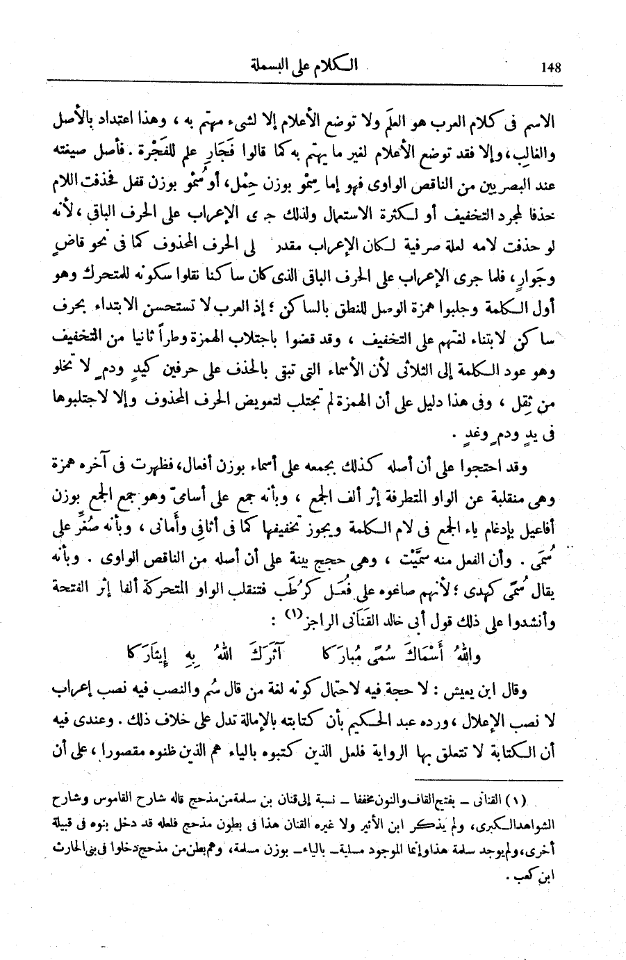 وَقَدِ احْتَجُّوا عَلَى أَنَّ أَصْلَهُ كَذَلِكَ بِجَمْعِهِ عَلَى أَسْمَاءٍ بِوَزْنِ أَفْعَالٍ، فَظَهَرَتْ فِي آخِرِهِ هَمْزَةٌ وَهِيَ مُنْقَلِبَةٌ عَنِ الْوَاوِ الْمُتَطَرِّفَةِ إِثْرَ أَلِفِ الْجَمْعِ، وَبِأَنَّهُ جُمِعَ عَلَى أَسَامِي وَهُوَ جَمْعُ الْجَمْعِ بِوَزْنِ أَفَاعِيلَ بِإِدْغَامِ يَاءِ الْجَمْعِ فِي لَامِ الْكَلِمَةِ وَيَجُوزُ تَخْفِيفُهَا كَمَا فِي أَثَافِي وَأَمَانِي، وَبِأَنَّهُ صُغِّرَ عَلَى سُمَيٍّ. وَأَنَّ الْفِعْلَ مِنْهُ سَمَّيْتُ، وَهِيَ حُجَجٌ بَيِّنَةٌ عَلَى أَنَّ أَصْلَهُ مِنَ النَّاقِصِ الْوَاوِيِّ. وَبِأَنَّهُ يُقَالُ سُمًى كَهُدًى لِأَنَّهُمْ صَاغُوهُ عَلَى فِعْلٍ كَرَطُبَ فَتَنْقَلِبُ الْوَاوُ الْمُتَحَرِّكَةُ أَلِفًا إِثْرَ الْفَتْحَةِ وَأَنْشَدُوا عَلَى ذَلِكَ قَوْلَ أَبِي خَالِدٍ الْقَنَانِيِّ الرَّاجِزِ (¬1) :
