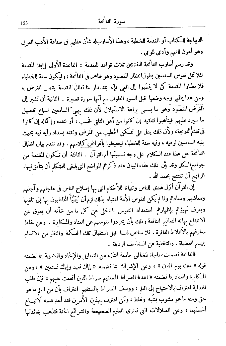 فَالْفَاتِحَةُ تَضَمَّنَتْ مُنَاجَاةً لِلْخَالِقِ جَامِعَةً التَّنَزُّهَ عَنِ التَّعْطِيلِ وَالْإِلْحَادِ وَالدَّهْرِيَّةِ بِمَا تَضَمَّنَهُ قَوْلُهُ: مَلِكِ يَوْمِ الدِّينِ، وَعَنِ الْإِشْرَاكِ بِمَا تَضَمَّنَهُ إِيَّاكَ نَعْبُدُ وَإِيَّاكَ نَسْتَعِينُ، وَعَنِ الْمُكَابَرَةِ وَالْعِنَادِ بِمَا تَضَمَّنَهُ اهْدِنَا الصِّراطَ الْمُسْتَقِيمَ صِراطَ الَّذِينَ أَنْعَمْتَ عَلَيْهِمْ فَإِنَّ طَلَبَ الْهِدَايَةِ اعْتِرَافٌ بِالِاحْتِيَاجِ إِلَى الْعِلْمِ، وَوَصْفُ الصِّرَاطِ بِالْمُسْتَقِيمِ اعْتِرَافٌ بِأَنَّ مِنَ الْعِلْمِ مَا هُوَ حَقٌّ وَمِنْهُ مَا هُوَ مَشُوبٌ بِشُبَهٍ وَغَلَطٍ، وَمَنِ اعْتَرَفَ بِهَذَيْنِ الْأَمْرَيْنِ فَقَدْ أَعَدَّ نَفْسَهُ لِاتِّبَاعِ أَحْسَنِهِمَا، وَعَنِ الضَّلَالَاتِ الَّتِي تَعْتَرِي الْعُلُومَ الصَّحِيحَةَ وَالشَّرَائِعَ الْحَقَّةَ فَتَذْهَبُ بِفَائِدَتِهَا