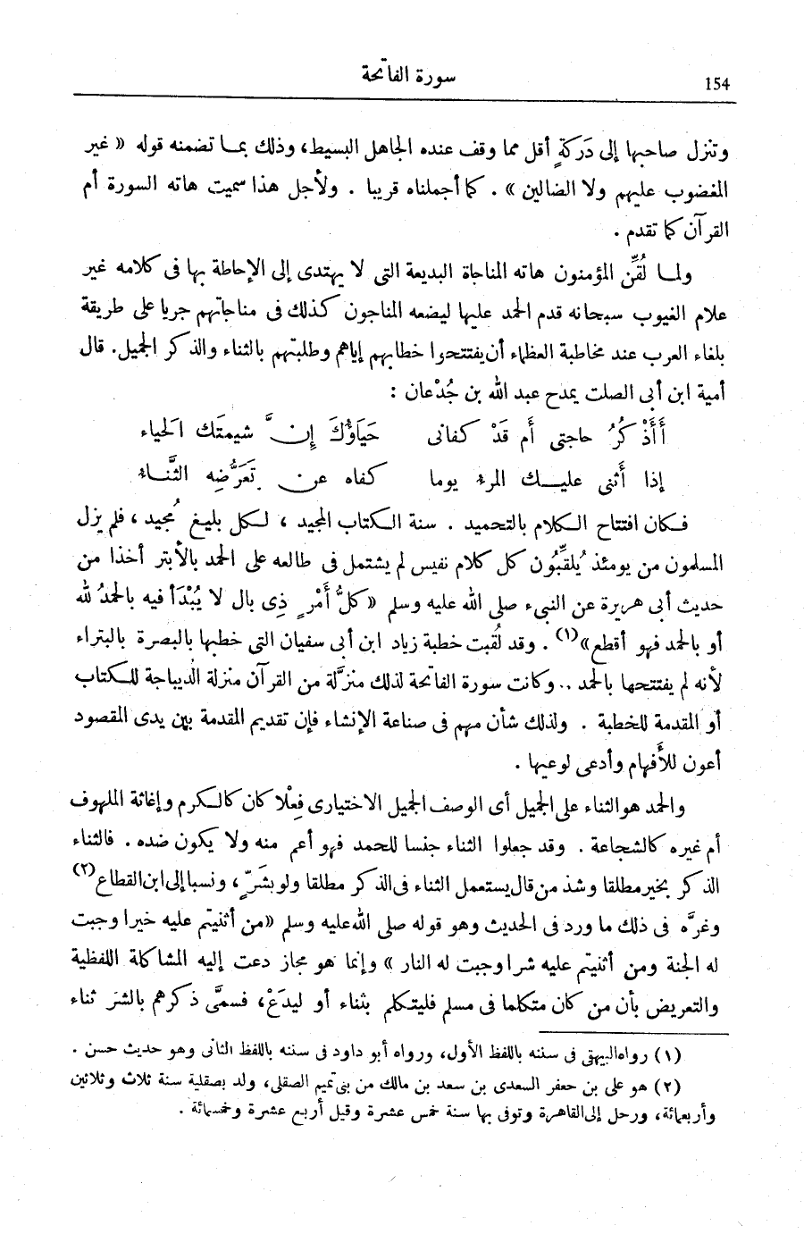 (¬1) . وَقَدْ لُقِّبَتْ خُطْبَةُ زِيَادِ ابْن أَبِي سُفْيَانَ الَّتِي خَطَبَهَا بِالْبَصْرَةِ بِالْبَتْرَاءِ لِأَنَّهُ لَمْ يَفْتَتِحْهَا بِالْحَمْدِ، وَكَانَتْ سُورَةُ الْفَاتِحَةِ لِذَلِكَ مُنَزَّلَةً مِنَ الْقُرْآنِ مَنْزِلَةَ الدِّيبَاجَةِ لِلْكِتَابِ أَوِ الْمُقَدِّمَةِ لِلْخُطْبَةِ، وَلِذَلِكَ شَأْنٌ مُهِمٌّ فِي صِنَاعَةِ الْإِنْشَاءِ فَإِنَّ تَقْدِيمَ الْمُقَدِّمَةِ بَيْنَ يَدي الْمَقْصُود أَعُود لِلْأَفْهَامِ وأدعى لوعيها.