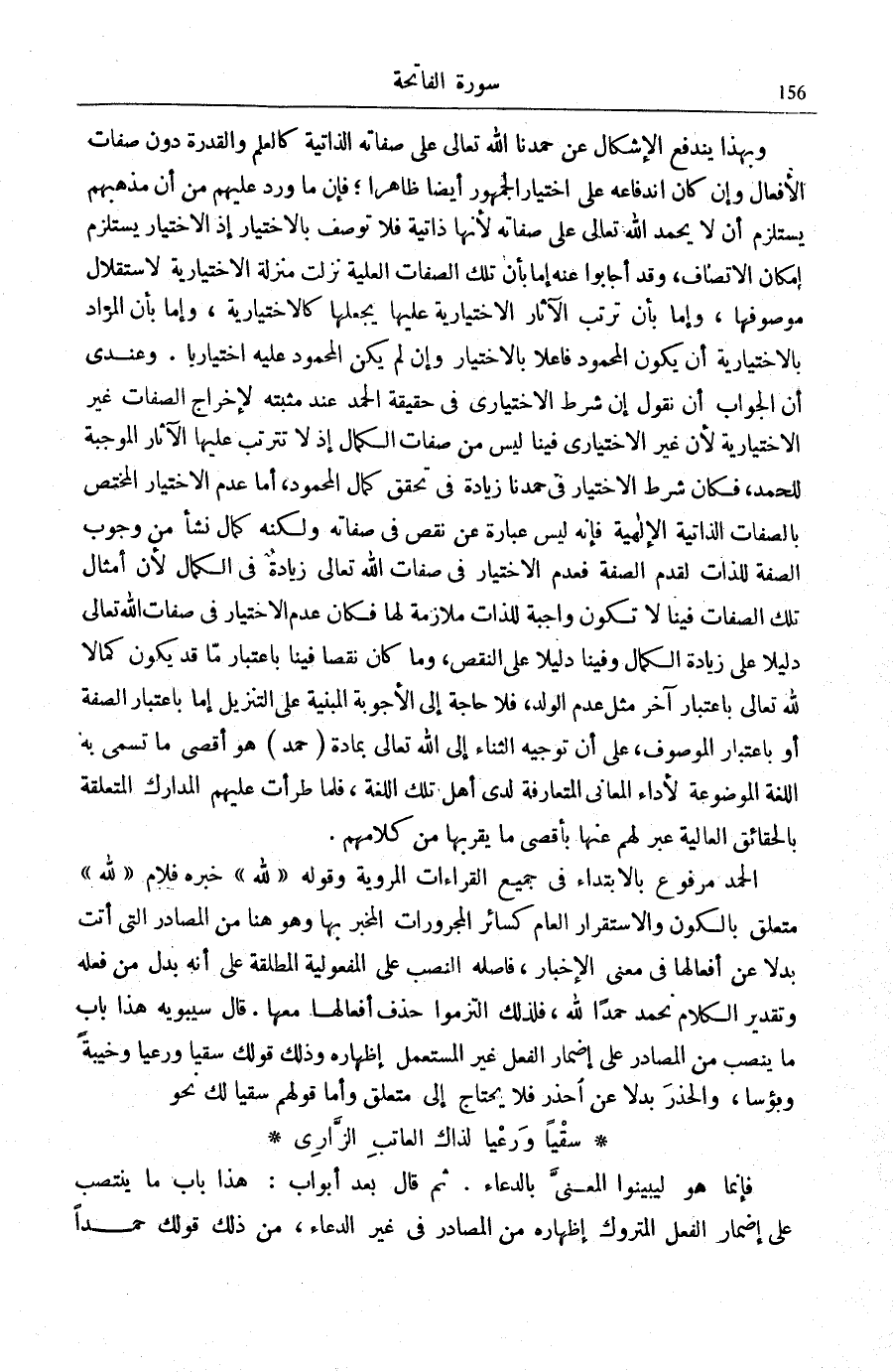 فَإِنَّمَا هُوَ لِيُبَيِّنُوا الْمَعْنَى بِالدُّعَاءِ. ثُمَّ قَالَ بَعْدَ أَبْوَابٍ: هَذَا بَابُ مَا يَنْتَصِبُ عَلَى إِضْمَارِ الْفِعْلِ الْمَتْرُوكِ إِظْهَارُهُ مِنَ الْمَصَادِرِ فِي غَيْرِ الدُّعَاءِ، مِنْ ذَلِكَ قَوْلُكُ حَمْدًا