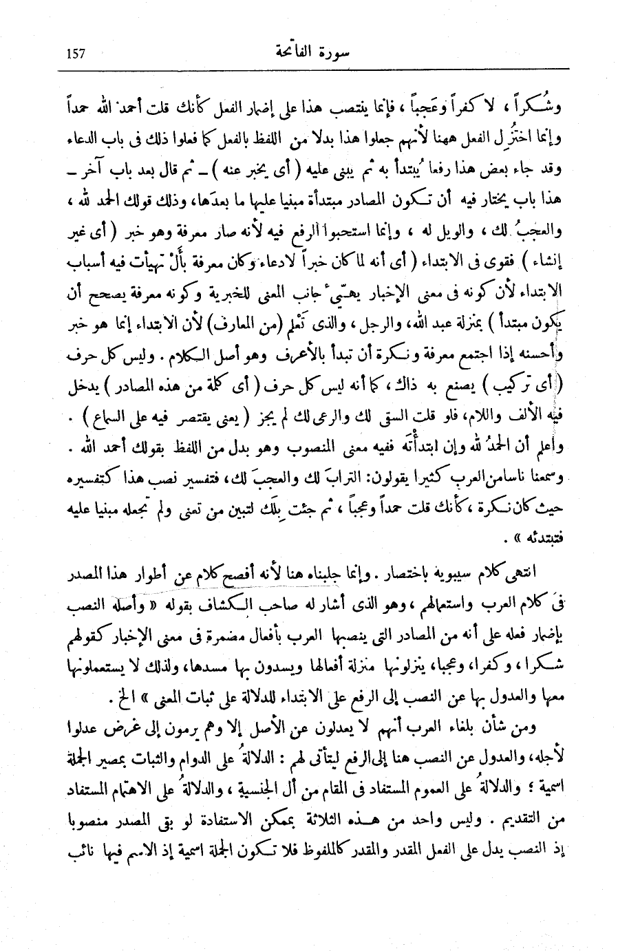 وَشُكْرًا لَا كُفْرًا وَعَجَبًا، فَإِنَّمَا يَنْتَصِبُ هَذَا عَلَى إِضْمَارِ الْفِعْلِ كَأَنَّكَ قُلْتَ أَحْمَدُ اللَّهَ حَمْدًا وَإِنَّمَا اخْتُزِلَ الْفِعْلُ هَاهُنَا لِأَنَّهُمْ جَعَلُوا هَذَا بَدَلًا مِنَ اللَّفْظِ بِالْفِعْلِ كَمَا فَعَلُوا ذَلِكَ فِي بَابِ الدُّعَاءِ وَقَدْ جَاءَ بَعْضُ هَذَا رَفْعًا يُبْتَدَأُ بِهِ ثُمَّ يُبْنَى عَلَيْهِ (أَيْ يُخْبَرُ عَنْهُ) ثُمَّ قَالَ بَعْدَ بَابٍ آخَرَ: هَذَا بَابٌ يُخْتَارُ فِيهِ أَنْ تَكُونَ الْمَصَادِرُ مُبْتَدَأَةً مَبْنِيًّا عَلَيْهَا مَا بَعْدَهَا، وَذَلِكَ قَوْلُكَ الْحَمْدُ لِلَّهِ،