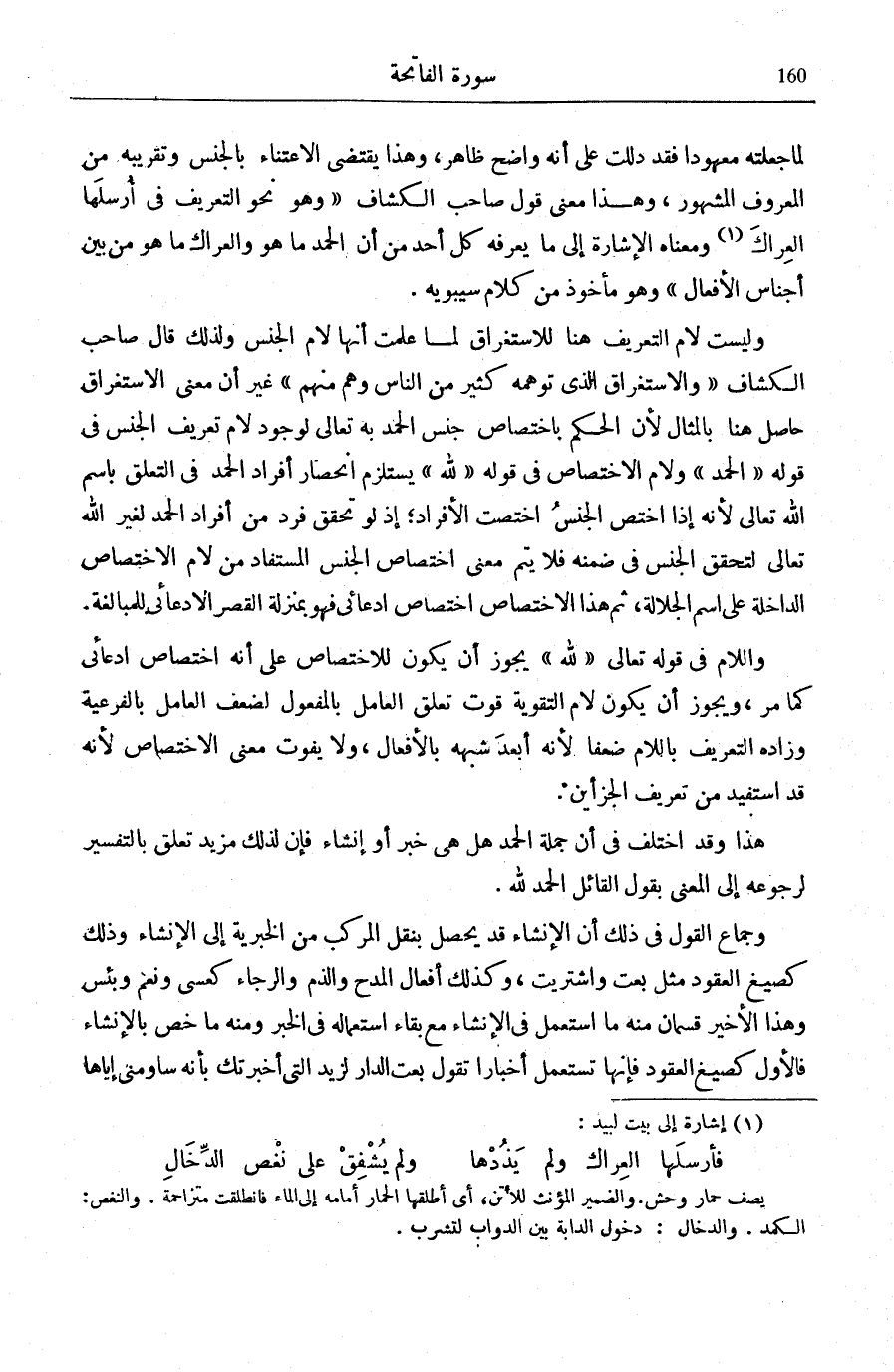 وَمَعْنَاهُ الْإِشَارَةُ إِلَى مَا يَعْرِفُهُ كُلُّ أَحَدٍ مِنْ أَنَّ الْحَمْدَ مَا هُوَ وَالْعِرَاكَ مَا هُوَ مِنْ بَيْنِ أَجْنَاسِ الْأَفْعَالِ» وَهُوَ مَأْخُوذٌ مِنْ كَلَامِ سِيبَوَيْهِ.