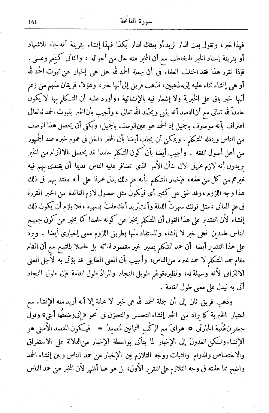 بِأَنَّ كَوْنَ الْمُتَكَلِّمِ حَامِدًا قَدْ يَحْصُلُ بِالِالْتِزَامِ مِنَ الْخَبَرِ يُرِيدُونَ أَنَّهُ لَازِمٌ عُرْفِيٌّ لِأَنَّ شَأْنَ الْأَمْرِ الَّذِي تَضَافَرَ عَلَيْهِ النَّاسُ قَدِيمًا أَنْ يَقْتَدِيَ بِهِمْ فِيهِ غَيْرُهُمْ مِنْ كُلِّ مَنْ عَلِمَهُ، فَإِخْبَارُ الْمُتَكَلِّمِ بِأَنَّهُ عَلِمَ ذَلِكَ يَدُلُّ عُرْفًا عَلَى أَنَّهُ مُقْتَدٍ بِهِمْ فِي ذَلِكَ هَذَا وَجْهُ اللُّزُومِ، وَقَدْ خَفِيَ عَلَى كَثِيرٍ أَيْ فَيَكُونُ مِثْلَ حُصُولِ لَازِمِ الْفَائِدَةِ مِنَ الْخَبَرِ الْمُقَرَّرَةٍ فِي عِلْمِ الْمَعَانِي، مِثْلَ قَوْلِكَ سَهِرْتَ اللَّيْلَةَ وَأَنْتَ تُرِيدُ أَنَّكَ عَلِمْتَ بِسَهَرِهِ، فَلَا يَلْزَمُ أَنْ يَكُونَ ذَلِكَ إِنْشَاءٌ لِأَنَّ التَّقْدِيرَ عَلَى هَذَا الْقَوْلِ أَنَّ الْمُتَكَلِّمَ يُخْبِرُ عَنْ كَوْنِهِ حَامِدًا كَمَا يُخْبِرُ عَنْ كَوْنِ جَمِيعِ النَّاسِ حَامِدِينَ فَهِيَ خَبَرٌ لَا إِنْشَاءٌ وَالْمُسْتَفَادُ مِنْهَا بِطَرِيقِ اللُّزُومِ مَعْنًى إِخْبَارِيٌّ أَيْضًا. وَيُرَدُّ على هَذَا التَّقْرِير أَيْضًا أَنَّ حَمْدَ الْمُتَكَلِّمِ يَصِيرُ غَيْرَ مَقْصُودٍ لِذَاتِهِ بَلْ حَاصِلًا بِالتَّبَعِ مَعَ أَنَّ الْمَقَامَ مَقَامَ حَمْدِ الْمُتَكَلِّمِ لَا حَمْدِ غَيْرِهِ مِنَ النَّاسِ، وَأُجِيبَ بِأَنَّ الْمَعْنَى الْمُطَابَقِيَّ قَدْ يُؤْتَى بِهِ لِأَجْلِ الْمَعْنَى الِالْتِزَامِيِّ لِأَنَّهُ وَسِيلَةٌ لَهُ، وَنَظِيرُهُ قَوْلُهُمْ طَوِيلُ النَّجَادِ وَالْمُرَادُ طُولُ الْقَامَةِ فَإِنَّ طُولَ النَّجَادِ أَتَى بِهِ لِيَدُلَّ عَلَى مَعْنَى طُولِ الْقَامَةِ.