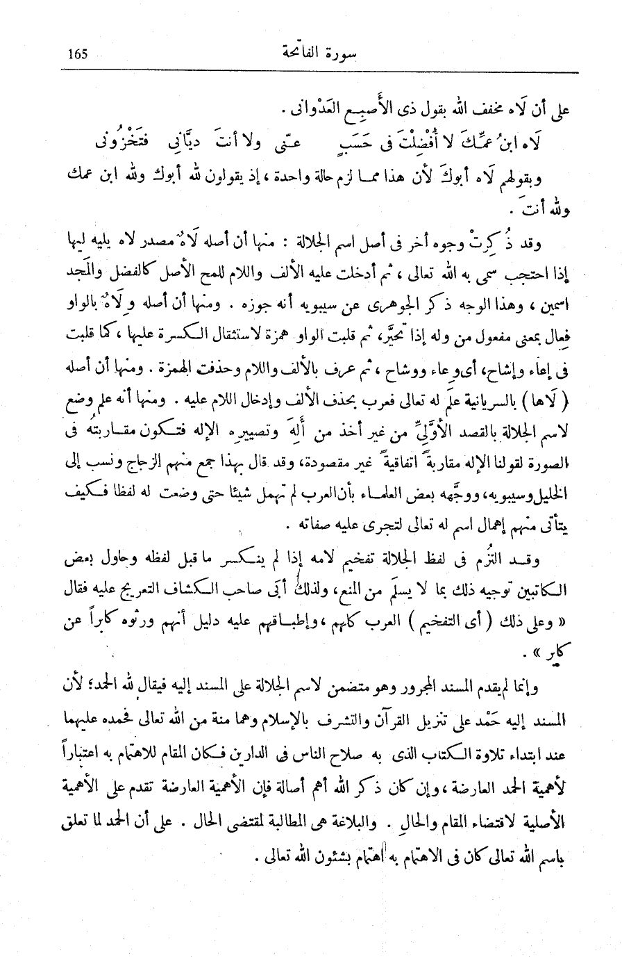 وَقَدِ الْتُزِمَ فِي لَفْظِ الْجَلَالَةِ تَفْخِيمُ لَامِهِ إِذَا لَمْ يَنْكَسِرْ مَا قَبْلَ لَفْظِهِ وَحَاوَلَ بَعْضُ الْكَاتِبِينَ تَوْجِيهَ ذَلِكَ بِمَا لَا يَسْلَمُ مِنَ الْمَنْعِ، وَلِذَلِكَ أَبَى صَاحِبُ «الْكَشَّافِ» التَّعْرِيجَ عَلَيْهِ فَقَالَ: «وَعَلَى ذَلِكَ (أَيِ التَّفْخِيمُ) الْعَرَبُ كُلُّهُمْ، وَإِطْبَاقُهُمْ عَلَيْهِ دَلِيلُ أَنَّهُمْ وَرِثُوهُ كَابِرًا عَنْ كَابِرٍ» .