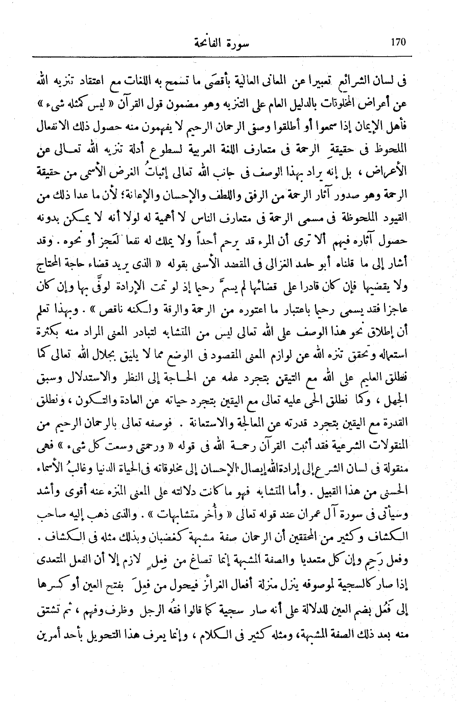 وَقَدْ أَشَارَ إِلَى مَا قُلْنَاهُ أَبُو حَامِدٍ الْغَزَالِيُّ فِي «الْمَقْصِدِ الْأَسْنَى» بِقَوْلِهِ: «الَّذِي يُرِيدُ قَضَاءَ حَاجَةِ الْمُحْتَاجِ وَلَا يَقْضِيهَا فَإِنْ كَانَ قَادِرًا عَلَى قَضَائِهَا لَمْ يُسَمَّ رَحِيمًا إِذْ لَوْ تَمَّتِ الْإِرَادَةُ لَوَفَى بِهَا وَإِنْ كَانَ عَاجِزًا فَقَدْ يُسَمَّى رَحِيمًا بِاعْتِبَارِ مَا اعْتَوَرَهُ مِنَ الرَّحْمَةِ وَالرِّقَّةِ وَلَكِنَّهُ نَاقِصٌ» . وَبِهَذَا تَعْلَمُ أَنَّ إِطْلَاقَ نَحْوِ هَذَا الْوَصْفِ عَلَى اللَّهِ تَعَالَى لَيْسَ مِنَ الْمُتَشَابِهِ لِتَبَادُرِ الْمَعْنَى الْمُرَادِ مِنْهُ بِكَثْرَةِ اسْتِعْمَالِهِ وَتَحَقُّقِ تنزه الله عَن لَوَازِمِ الْمَعْنَى الْمَقْصُودِ فِي الْوَضْعِ مِمَّا لَا يَلِيقُ بِجَلَالِ اللَّهِ تَعَالَى كَمَا نُطْلِقُ الْعَلِيمَ عَلَى اللَّهِ مَعَ التَّيَقُّنِ بِتَجَرُّدِ عِلْمِهِ عَنِ