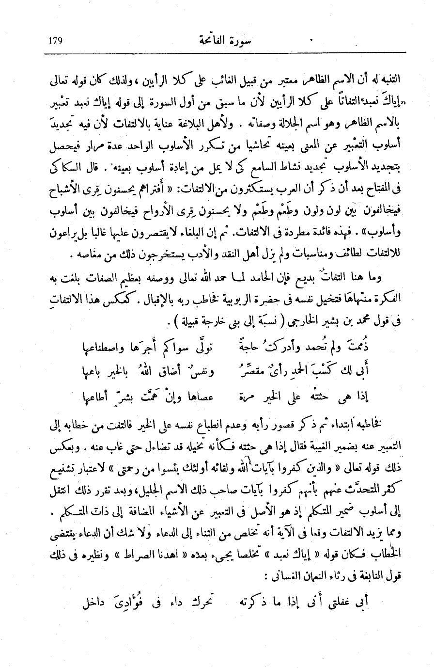 فَخَاطَبَهُ ابْتِدَاءً ثُمَّ ذَكَرَ قُصُورَ رَأْيِهِ وَعَدَمَ انْطِبَاعِ نَفْسِهِ عَلَى الْخَيْرِ فَالْتَفَتَ مِنْ خِطَابِهِ إِلَى التَّعْبِيرِ عَنْهُ بِضَمِيرِ الْغَيْبَةِ فَقَالَ: إِذَا هِيَ حَثَّتْهُ فَكَأَنَّهُ تَخَيَّلَهُ قَدْ تَضَاءَلَ حَتَّى غَابَ عَنْهُ، وَبِعَكْسِ ذَلِكَ قَوْلُهُ تَعَالَى: وَالَّذِينَ كَفَرُوا بِآياتِ اللَّهِ وَلِقائِهِ أُولئِكَ يَئِسُوا مِنْ رَحْمَتِي [العنكبوت: 23] لِاعْتِبَارِ تَشْنِيعِ كُفْرِ الْمُتَحَدَّثِ عَنْهُمْ بِأَنَّهُمْ كَفَرُوا بِآيَاتِ صَاحِبِ ذَلِكَ الِاسْمِ الْجَلِيلِ، وَبَعْدَ تَقُرُّرِ ذَلِكَ انْتَقَلَ إِلَى أُسْلُوبِ ضَمِيرِ الْمُتَكَلِّمِ إِذْ هُوَ الْأَصْلُ فِي التَّعْبِيرِ عَنِ الْأَشْيَاءِ الْمُضَافَةِ إِلَى ذَاتِ الْمُتَكَلِّمِ. وَمِمَّا يَزِيدُ الِالْتِفَاتَ وَقْعًا فِي الْآيَةِ أَنَّهُ تَخَلَّصَ مِنَ الثَّنَاءِ إِلَى الدُّعَاءِ وَلَا شَكَّ أَنَّ الدُّعَاءَ يَقْتَضِي الْخِطَابَ فَكَانَ قَوْلُهُ: إِيَّاكَ نَعْبُدُ تَخَلُّصًا يَجِيءُ بَعْدَهُ: اهْدِنَا الصِّراطَ وَنَظِيرُهُ فِي ذَلِكَ قَوْلُ النَّابِغَةِ فِي رِثَاءِ النُّعْمَانِ الْغَسَّانِيِّ: