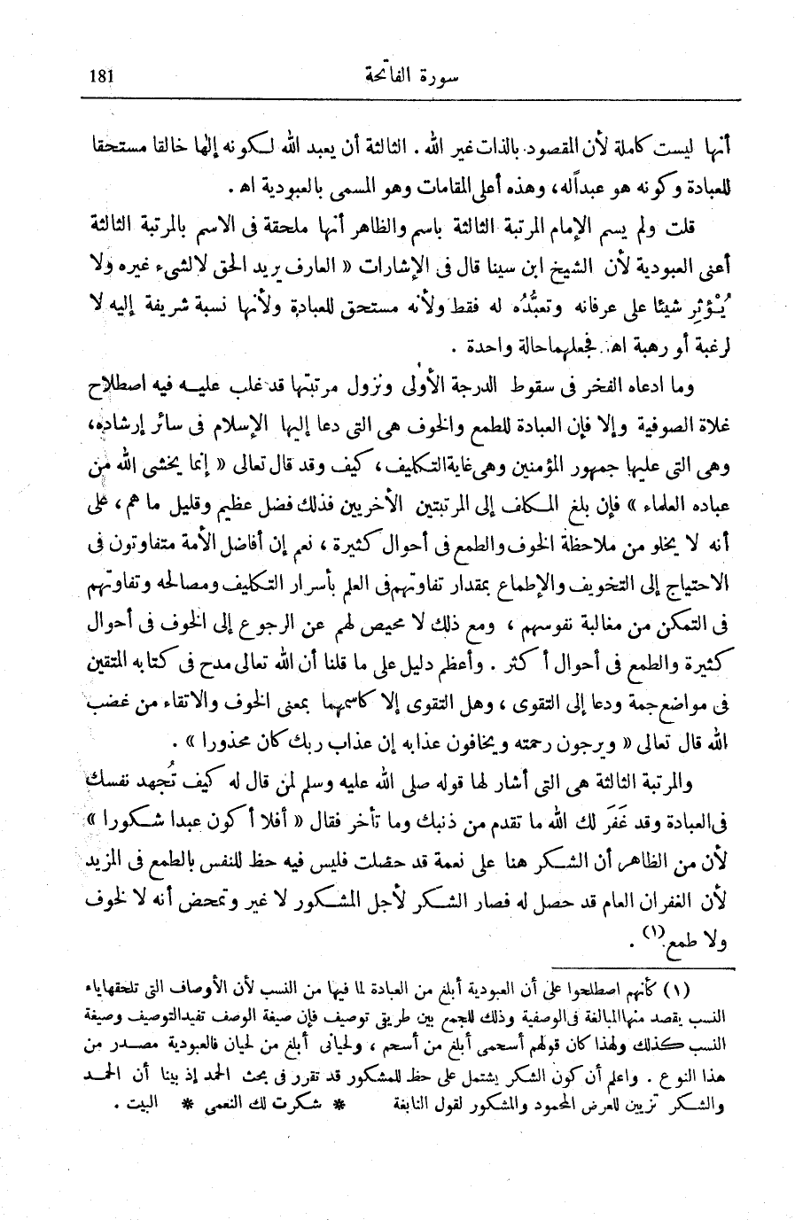 قُلْتُ وَلَمْ يُسَمِّ الْإِمَامُ الْمَرْتَبَةَ الثَّالِثَةَ بِاسْمٍ وَالظَّاهِرُ أَنَّهَا مُلْحَقَةٌ فِي الِاسْمِ بِالْمَرْتَبَةِ الثَّالِثَةِ أَعْنِي الْعُبُودِيَّةَ لِأَنَّ الشَّيْخَ ابْنَ سِينَا قَالَ فِي «الْإِشَارَاتِ» : ((الْعَارِفُ يُرِيدُ الْحَقَّ لَا لِشَيْءٍ غَيْرِهِ وَلَا يُؤْثِرُ شَيْئًا عَلَى عِرْفَانِهِ وَتَعَبُّدُهُ لَهُ فَقَطْ وَلِأَنَّهُ مُسْتَحِقٌّ لِلْعِبَادَةِ وَلِأَنَّهَا نِسْبَةٌ شَرِيفَةٌ إِلَيْهِ لَا لِرَغْبَةٍ أَوْ رَهْبَةٍ)) اهـ فَجَعَلَهُمَا حَالَةً وَاحِدَةً.