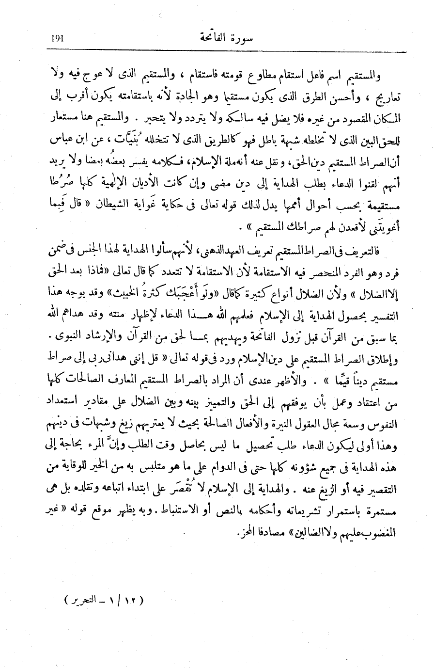 مَجَالِ الْعُقُولِ النَّيِّرَةِ وَالْأَفْعَالِ الصَّالِحَةِ بِحَيْثُ لَا يَعْتَرِيهِمْ زَيْغٌ وَشُبْهَاتٌ فِي دِينِهِمْ وَهَذَا أَوْلَى لِيَكُونَ الدُّعَاءُ طَلَبَ تَحْصِيلِ مَا لَيْسَ بِحَاصِلٍ وَقْتَ الطَّلَبِ وَإِنَّ الْمَرْءَ بِحَاجَةٍ إِلَى هَذِهِ الْهِدَايَةِ فِي جَمِيع شؤونه كُلِّهَا حَتَّى فِي الدَّوَامِ عَلَى مَا هُوَ مُتَلَبِّسٌ بِهِ مِنَ الْخَيْرِ لِلْوِقَايَةِ مِنَ التَّقْصِيرِ فِيهِ أَوِ الزَّيْغِ عَنْهُ. وَالْهِدَايَةُ إِلَى الْإِسْلَامِ لَا تُقْصَرُ عَلَى ابْتِدَاءِ اتِّبَاعِهِ وَتَقَلُّدِهِ بَلْ هِيَ مُسْتَمِرَّةٌ بِاسْتِمْرَارِ تَشْرِيعَاتِهِ وَأَحْكَامِهِ بِالنَّصِّ أَوِ الِاسْتِنْبَاطِ. وَبِهِ يَظْهَرُ مَوْقِعُ قَوْلِهِ: غَيْرِ الْمَغْضُوبِ عَلَيْهِمْ وَلَا الضَّالِّينَ مُصَادِفًا الْمِحَزِّ