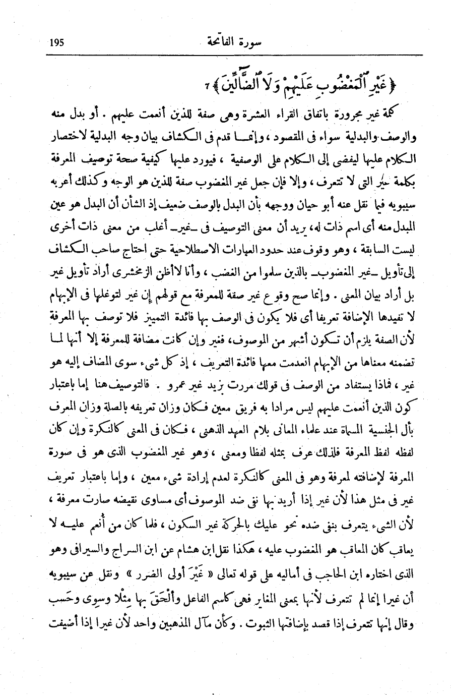 هَذَا لِأَنَّ غَيْرَ إِذَا أُرِيدَ بِهَا نَفْيُ ضِدِّ الْمَوْصُوفِ أَيْ مُسَاوِي نَقِيضِهِ صَارَتْ مُعَرَّفَةً، لِأَنَّ الشَّيْءَ يَتَعَرَّفُ بِنَفْيِ ضِدِّهِ نَحْوُ عَلَيْكَ بِالْحَرَكَةِ غَيْرِ السُّكُونِ، فَلَمَّا كَانَ مَنْ أُنْعِمَ عَلَيْهِ لَا يُعَاقَبُ كَانَ الْمُعَاقَبُ هُوَ الْمَغْضُوبَ عَلَيْهِ، هَكَذَا نَقَلَ ابْنُ هِشَامٍ عَنِ ابْنِ السَّرَّاجِ وَالسِّيرَافِيِّ وَهُوَ الَّذِي اخْتَارَهُ ابْنُ الْحَاجِبِ فِي أَمَالِيهِ عَلَى قَوْلِهِ تَعَالَى: غَيْرُ أُولِي الضَّرَرِ [النِّسَاء: 95] وَنقل عَن سيبوبه أَن غيرا إِنَّمَا لَمْ تَتَعَرَّفْ لِأَنَّهَا بِمَعْنَى الْمُغَايِرِ فَهِيَ كَاسْمِ الْفَاعِلِ وَأَلْحَقَ بِهَا مِثْلًا وَسِوَى وَحَسْبَ وَقَالَ: إِنَّهَا تَتَعَرَّفُ إِذَا قُصِدَ بِإِضَافَتِهَا الثُّبُوتُ. وَكَأَنَّ مَآلَ الْمَذْهَبَيْنِ وَاحِد لِأَن غيرا إِذَا أُضِيفَتْ