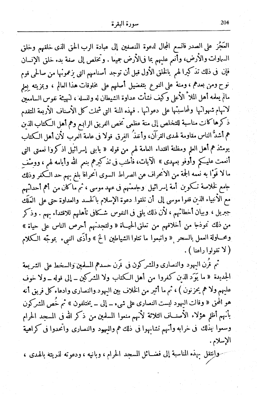 ثُمَّ قُرِنَ الْيَهُودُ وَالنَّصَارَى وَالْمُشْرِكُونَ فِي قَرْنِ حَسَدِهِمُ الْمُسْلِمِينَ وَالسُّخْطِ عَلَى الشَّرِيعَةِ الْجَدِيدَةِ: مَا يَوَدُّ الَّذِينَ كَفَرُوا مِنْ أَهْلِ الْكِتابِ وَلَا الْمُشْرِكِينَ إِلَى قَوْلِهِ: وَلا خَوْفٌ عَلَيْهِمْ وَلا هُمْ يَحْزَنُونَ [الْبَقَرَة: 105- 112] ، ثُمَّ مَا أُثِيرَ مِنَ الْخِلَافِ بَيْنَ الْيَهُودِ وَالنَّصَارَى وَادِّعَاءُ كُلِّ فَرِيقٍ أَنَّهُ هُوَ الْمُحِقُّ: وَقالَتِ الْيَهُودُ لَيْسَتِ النَّصارى عَلى شَيْءٍ إِلَى يَخْتَلِفُونَ [الْبَقَرَة: 113] ثُمَّ خُصَّ الْمُشْرِكُونَ بِأَنَّهُمْ أَظْلَمُ هَؤُلَاءِ الْأَصْنَافِ الثَّلَاثَةِ لِأَنَّهُمْ مَنَعُوا الْمُسْلِمِينَ مِنْ ذِكْرِ اللَّهِ فِي الْمَسْجِدِ الْحَرَامِ وَسَعَوْا بِذَلِكَ فِي خَرَابِهِ وَأَنَّهُمْ تَشَابَهُوا فِي ذَلِكَ هُمْ وَالْيَهُودُ وَالنَّصَارَى وَاتَّحَدُوا فِي كَرَاهِيَةِ الْإِسْلَامِ.