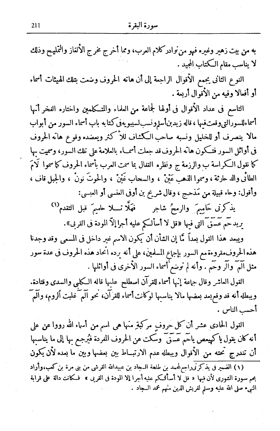 يُرِيدُ حم عسق [الشورى: 1، 2] الَّتِي فِيهَا: قُلْ لَا أَسْئَلُكُمْ عَلَيْهِ أَجْراً إِلَّا الْمَوَدَّةَ فِي الْقُرْبى [الشورى: 23] . وَيَبْعُدُ هَذَا الْقَوْلُ بُعْدًا مَا إِنِ الشَّأْنُ أَنْ يَكُونَ الِاسْمُ غَيْرَ دَاخِلٍ فِي الْمُسَمَّى وَقَدْ وَجَدْنَا هَذِهِ الْحُرُوفَ مَقْرُوءَةً مَعَ السُّوَرِ بِإِجْمَاعِ الْمُسْلِمِينَ، عَلَى أَنَّهُ يَرُدُّهُ اتِّحَادُ هَذِهِ الْحُرُوفِ فِي عِدَّةِ سُوَرٍ مِثْلَ الم والر وحم. وَأَنَّهُ لَمْ تُوضَعْ أَسْمَاءُ السُّوَرِ الْأُخْرَى فِي أَوَائِلِهَا.