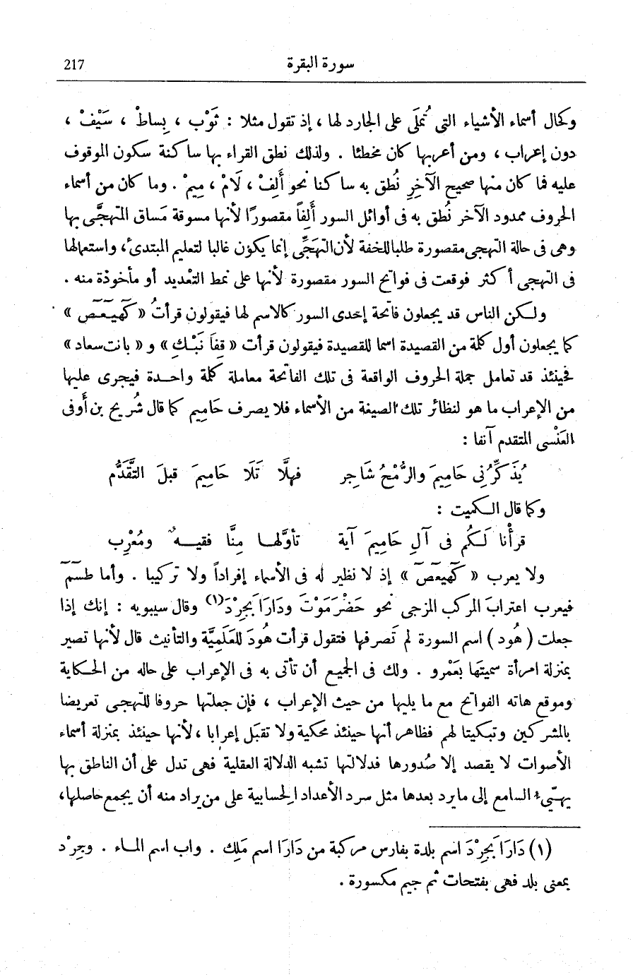 وَلَكِنَّ النَّاسَ قَدْ يَجْعَلُونَ فَاتِحَةَ إِحْدَى السُّوَرِ كَالِاسْمِ لَهَا فَيَقُولُونَ قَرَأْتُ: كهيعص كَمَا يَجْعَلُونَ أَوَّلَ كَلِمَةٍ مِنَ الْقَصِيدَةِ اسْمًا لِلْقَصِيدَةِ فَيَقُولُونَ قَرَأْتُ: «قِفَا نَبْكِ» وَ «بَانَتْ سُعَادُ» فَحِينَئِذٍ قَدْ تُعَامَلُ جُمْلَةُ الْحُرُوفِ الْوَاقِعَةِ فِي تِلْكَ الْفَاتِحَةِ مُعَامَلَةَ كَلِمَةٍ وَاحِدَةٍ فَيَجْرِي عَلَيْهَا مِنَ الْإِعْرَابِ مَا هُوَ لِنَظَائِرِ تِلْكَ الصِّيغَةِ مِنَ الْأَسْمَاءِ فَلَا يُصْرَفُ حَامِيمُ كَمَا قَالَ شُرَيْحُ بْنُ أَوْفَى الْعَنْسِيُّ الْمُتَقَدِّمُ آنِفًا: