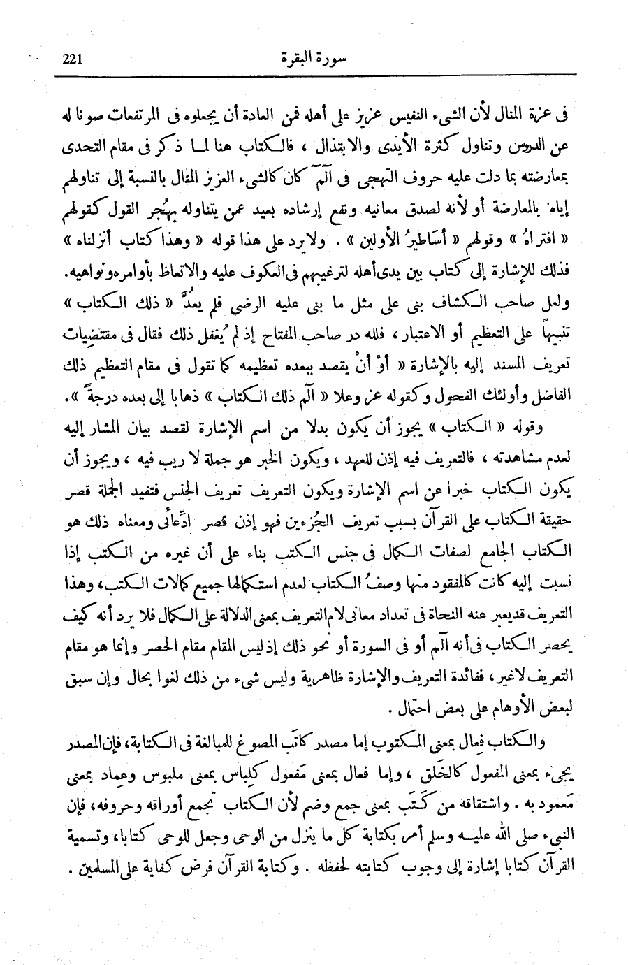 وَقَوْلُهُ: الْكِتابُ يَجُوزُ أَنْ يَكُونَ بَدَلًا مِنَ اسْمِ الْإِشَارَةِ لِقَصْدِ بَيَانِ الْمُشَارِ إِلَيْهِ لِعَدَمِ مُشَاهَدَتِهِ، فَالتَّعْرِيفُ فِيهِ إِذَنْ لِلْعَهْدِ، وَيَكُونُ الْخَبَرُ هُوَ جُمْلَةُ لَا رَيْبَ فِيهِ، وَيَجُوزُ أَنْ يَكُونَ (الْكِتَابُ) خَبَرًا عَنِ اسْمِ الْإِشَارَةِ وَيَكُونُ التَّعْرِيفُ تَعْرِيفُ الْجِنْسِ فَتُفِيدُ الْجُمْلَةُ قَصْرَ حَقِيقَةِ الْكِتَابِ عَلَى الْقُرْآنِ بِسَبَب تَعْرِيف الجزءين فَهُوَ إِذَنْ قَصْرٌ ادِّعَائِيٌ وَمَعْنَاهُ ذَلِكَ هُوَ الْكِتَابُ الْجَامِعُ لِصِفَاتِ الْكَمَالِ فِي جِنْسِ الْكُتُبِ بِنَاءً عَلَى أَنَّ غَيْرَهُ مِنَ الْكُتُبِ إِذَا نُسِبَتْ إِلَيْهِ كَانَتْ كَالْمَفْقُودِ مِنْهَا وَصْفَ الْكِتَابِ لِعَدَمِ اسْتِكْمَالِهَا جَمِيعِ كَمَالَاتِ الْكُتُبِ، وَهَذَا التَّعْرِيفُ قَدْ يُعَبِّرُ عَنْهُ النُّحَاةُ فِي تَعْدَادِ مَعَانِي لَامِ التَّعْرِيفِ بِمَعْنَى الدَّلَالَةِ عَلَى الْكَمَالِ فَلَا يَرِدُ أَنَّهُ كَيْفَ يُحْصَرُ الْكِتَابُ فِي أَنَّهُ الم أَوْ فِي السُّورَةِ أَوْ نَحْوِ ذَلِكَ إِذْ لَيْسَ الْمَقَامُ مَقَامَ الْحَصْرِ وَإِنَّمَا هُوَ مَقَامُ التَّعْرِيفِ لَا غَيْرَ، فَفَائِدَةُ التَّعْرِيفِ وَالْإِشَارَةِ ظَاهِرِيَّةٌ وَلَيْسَ شَيْءٌ مِنْ ذَلِكَ لَغْوًا بِحَالٍ وَإِنْ سَبَقَ لِبَعْضِ الْأَوْهَامِ عَلَى بعض احْتِمَال.