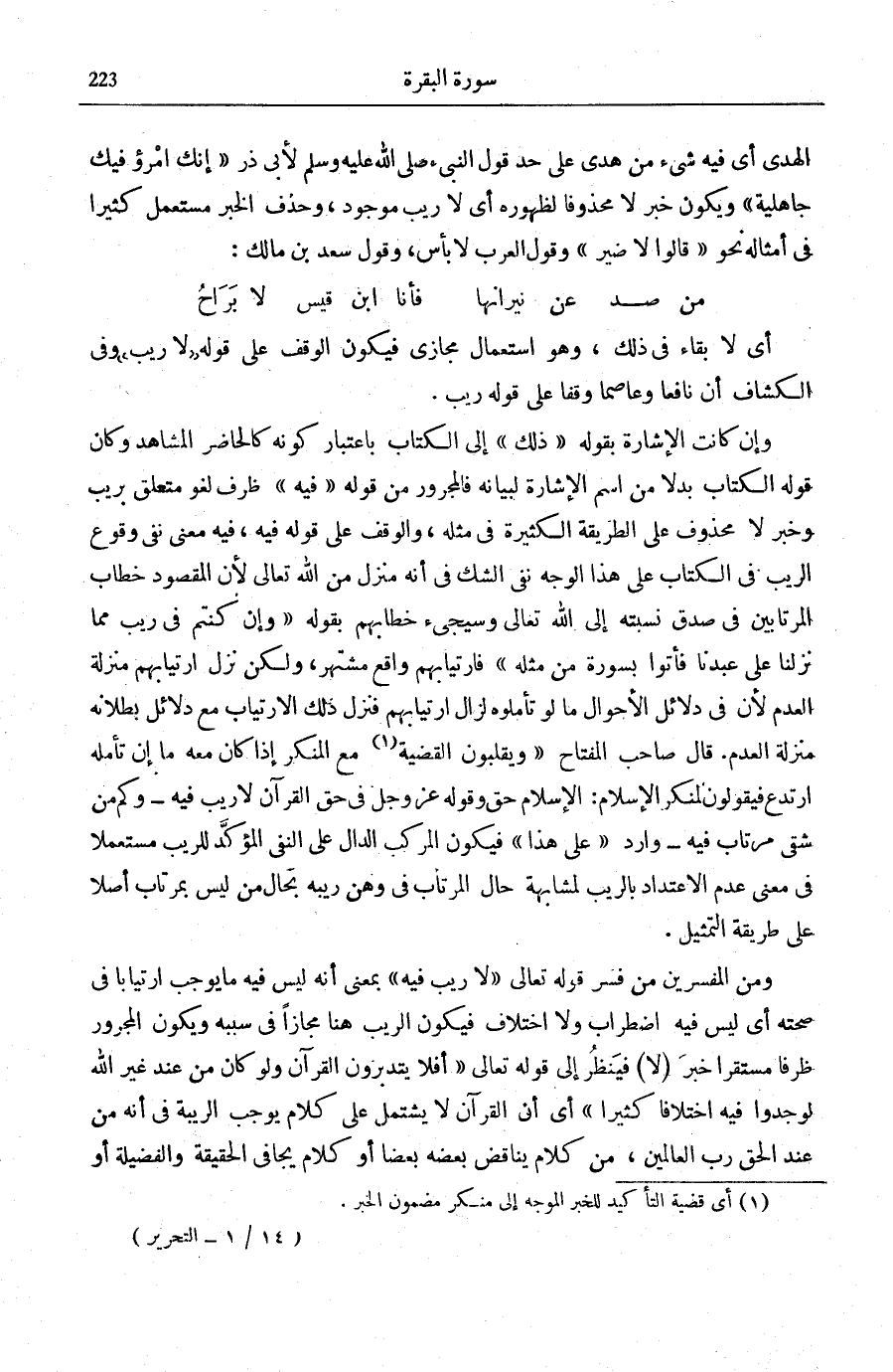 وَإِنْ كَانَتِ الْإِشَارَةُ بِقَوْلِهِ: ذلِكَ إِلَى الْكِتابُ بِاعْتِبَارِ كَوْنِهِ كَالْحَاضِرِ الْمُشَاهَدِ وَكَانَ قَوْلُهُ الْكِتابُ بَدَلًا مِنَ اسْمِ الْإِشَارَةِ لِبَيَانِهِ فَالْمَجْرُورُ مِنْ قَوْلِهِ: فِيهِ ظَرْفُ لَغْوٍ مُتَعَلِّقٌ بِرَيْبَ وَخَبَرُ لَا مَحْذُوفٌ عَلَى الطَّرِيقَةِ الْكَثِيرَةِ فِي مِثْلِهِ، وَالْوَقْفُ عَلَى قَوْلِهِ فِيهِ، فِيهِ مَعْنَى نَفْيِ وُقُوعِ الرَّيْبِ فِي الْكِتَابِ عَلَى هَذَا الْوَجْهِ نَفْيِ الشَّكِّ فِي أَنَّهُ مُنَزَّلٌ مِنَ اللَّهِ تَعَالَى لِأَنَّ الْمَقْصُودَ خِطَابُ الْمُرْتَابِينَ فِي صِدْقِ نِسْبَتِهِ إِلَى الله تَعَالَى وسيجيئ خِطَابُهُمْ