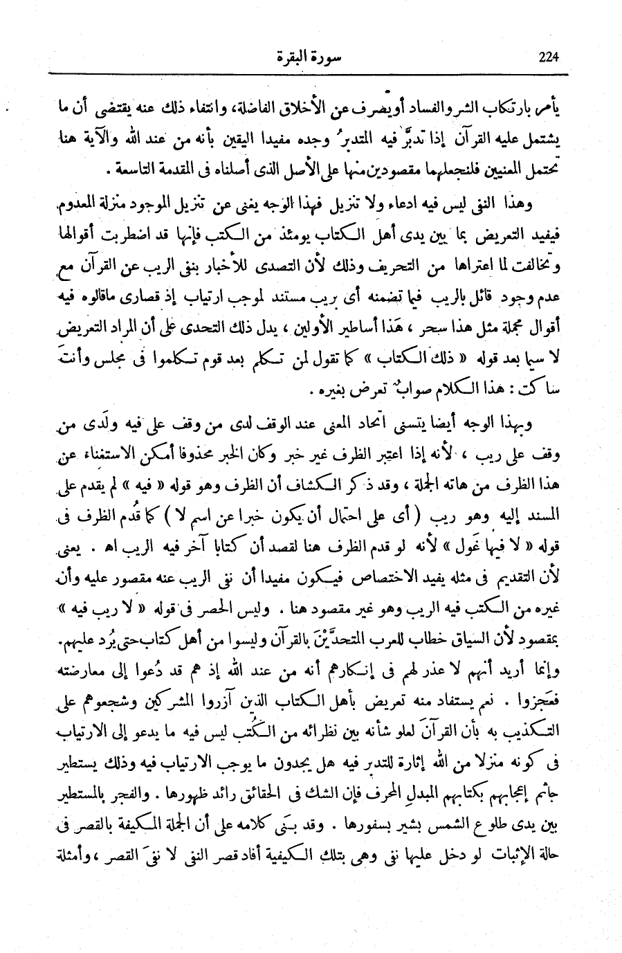 فِيهِ لَمْ يُقَدَّمْ عَلَى الْمَسْنَدِ إِلَيْهِ وَهُوَ رَيْبَ (أَيْ عَلَى احْتِمَالِ أَنْ يَكُونَ خَبَرًا عَنِ اسْمٍ لَا) كَمَا قُدِّمَ الظَّرْفُ فِي قَوْلِهِ: لَا فِيها غَوْلٌ [الصافات: 47] لِأَنَّهُ لَوْ قُدِّمَ الظَّرْفُ هُنَا لَقَصَدَ أَنَّ كِتَابًا آخَرَ فِيهِ الرَّيْبُ اهـ. يَعْنِي لِأَنَّ التَّقْدِيمَ فِي مِثْلِهِ يُفِيدُ الِاخْتِصَاصَ فَيَكُونُ مُفِيدًا أَنَّ نَفْيَ الرَّيْبِ عَنْهُ مَقْصُورٌ عَلَيْهِ وَأَنَّ غَيْرَهُ مِنَ الْكُتُبِ فِيهِ الرَّيْبُ وَهُوَ غَيْرُ مَقْصُودٍ هُنَا. وَلَيْسَ الْحَصْرُ فِي قَوْلِهِ: لَا رَيْبَ فِيهِ بِمَقْصُودٍ لِأَنَّ السِّيَاقَ خِطَابٌ لِلْعَرَبِ الْمُتَحَدَّيْنَ بِالْقُرْآنِ وَلَيْسُوا مِنْ أَهْلِ كِتَابٍ حَتَّى يُرَدَّ عَلَيْهِمْ. وَإِنَّمَا أُرِيدَ أَنَّهُمْ لَا عُذْرَ لَهُمْ فِي إِنْكَارِهِمْ أَنَّهُ مِنْ عِنْدِ اللَّهِ إِذْ هُمْ قَدْ دُعُوا إِلَى مُعَارَضَتِهِ فَعَجَزُوا. نَعَمْ يُسْتَفَادُ مِنْهُ تَعْرِيضٌ بِأَهْلِ الْكِتَابِ الَّذِينَ آزَرُوا الْمُشْرِكِينَ وَشَجَّعُوهُمْ عَلَى التَّكْذِيبِ بِهِ بِأَنَّ الْقُرْآنَ لِعُلُوِّ شَأْنِهِ بَيْنَ نُظَرَائِهِ مِنَ الْكُتُبِ لَيْسَ فِيهِ مَا يَدْعُو إِلَى الِارْتِيَابِ فِي كَوْنِهِ مُنَزَّلًا مِنَ اللَّهِ إِثَارَةً لِلتَّدَبُّرِ فِيهِ هَلْ يَجِدُونَ مَا يُوجِبُ الِارْتِيَابَ فِيهِ وَذَلِكَ يَسْتَطِيرُ جَاثِمَ إِعْجَابِهِمْ بِكِتَابِهِمُ الْمُبَدَّلِ الْمُحَرَّفِ فَإِنَّ الشَّكَّ فِي الْحَقَائِقِ رَائِدُ ظُهُورِهَا. وَالْفَجْرُ بِالْمُسْتَطِيرِ بَيْنَ يَدَيْ طُلُوعِ الشَّمْسِ بَشِيرٌ بِسُفُورِهَا. وَقَدْ بَنَى كَلَامَهُ عَلَى أَنَّ الْجُمْلَةَ الْمُكَيَّفَةَ بِالْقَصْرِ فِي حَالَةِ الْإِثْبَاتِ لَوْ دَخَلَ عَلَيْهَا نَفْيٌ وَهِيَ بِتِلْكَ الْكَيْفِيَّةِ أَفَادَ قَصْرَ النَّفْيَ لَا نَفْيَ الْقَصْرِ، وَأَمْثِلَةُ