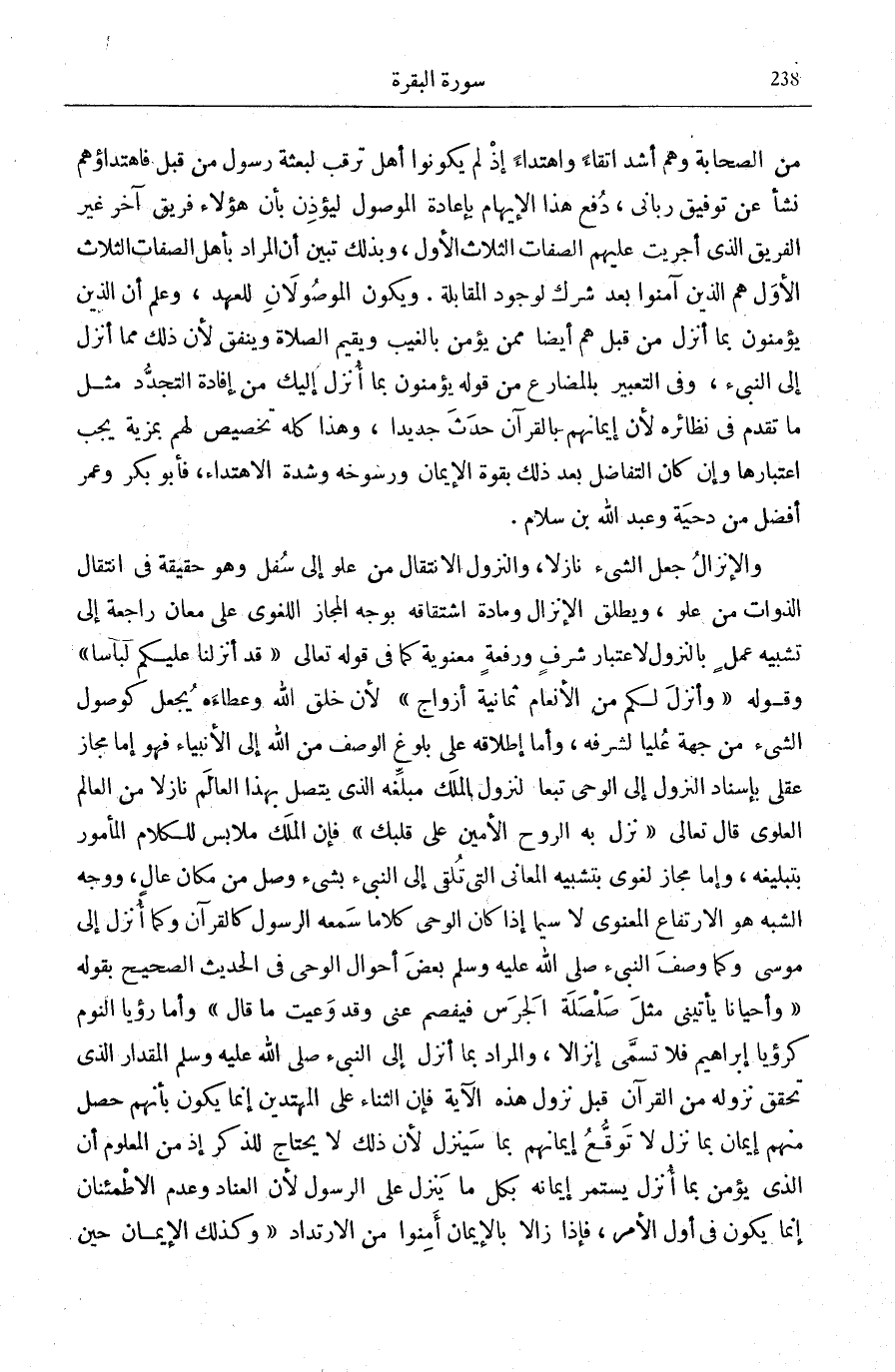 مِنَ الصَّحَابَةِ وَهُمْ أَشَدُّ اتِّقَاءً وَاهْتِدَاءً إِذْ لَمْ يَكُونُوا أَهْلَ تَرَقُّبٍ لِبَعْثَةِ رَسُولٍ مِنْ قَبْلُ فَاهْتِدَاؤُهُمْ نَشَأَ عَنْ تَوْفِيقٍ رَبَّانِيٍّ، دُفِعَ هَذَا الْإِيهَامُ بِإِعَادَةِ الْمَوْصُولِ لِيُؤْذِنَ بِأَنَّ هَؤُلَاءِ فَرِيقٌ آخَرُ غَيْرُ الْفَرِيقِ الَّذِي أُجْرِيَتْ عَلَيْهِمُ الصِّفَاتُ الثَّلَاثُ الْأُوَلُ، وَبِذَلِكَ تَبَيَّنَ أَنَّ الْمُرَادَ بِأَهْلِ الصِّفَاتِ الثَّلَاثِ الْأُوَلِ هُمُ الَّذِينَ آمَنُوا بَعْدَ شِرْكٍ لِوُجُودِ الْمُقَابَلَةِ. وَيَكُونُ الْمَوْصُولَانِ لِلْعَهْدِ، وَعَلِمَ أَنَّ الَّذِينَ يُؤْمِنُونَ بِمَا أُنْزِلَ مِنْ قَبْلُ هُمْ أَيْضًا مِمَّنْ يُؤْمِنُ بِالْغَيْبِ وَيُقِيمُ الصَّلَاةَ وَيُنْفِقُ لِأَنَّ ذَلِكَ مِمَّا أُنْزِلَ إِلَى النَّبِيءِ، وَفِي التَّعْبِيرِ بِالْمُضَارِعِ مِنْ قَوْلِهِ يُؤْمِنُونَ بِما أُنْزِلَ إِلَيْكَ مِنْ إِفَادَةِ التَّجَدُّدِ مِثْلَ مَا تَقَدَّمَ فِي نَظَائِرِهِ لِأَنَّ إِيمَانَهُمْ بِالْقُرْآنِ حَدَثَ جَدِيدًا، وَهَذَا كُلُّهُ تَخْصِيصٌ لَهُمْ بِمَزِيَّةٍ يَجِبُ اعْتِبَارُهَا وَإِنْ كَانَ التَّفَاضُلُ بَعْدَ ذَلِكَ بِقُوَّةِ الْإِيمَانِ وَرُسُوخِهِ وَشِدَّةِ الِاهْتِدَاءِ، فَأَبُو بَكْرٍ وَعُمَرُ أَفْضَلُ مِنْ دِحْيَةَ وَعَبْدِ اللَّهِ بْنِ سَلَامٍ.