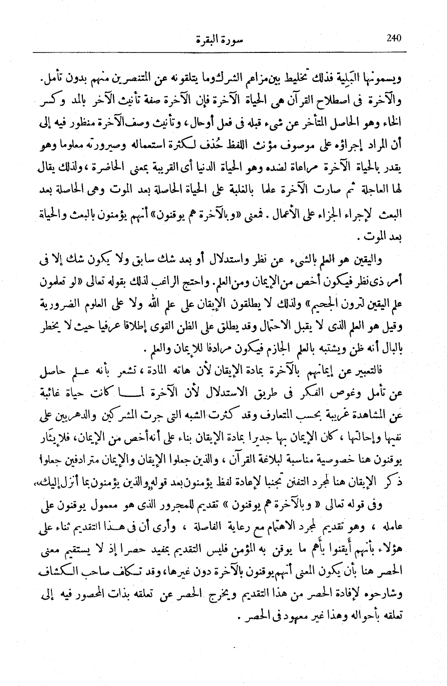 وَفِي قَوْلِهِ تَعَالَى: وَبِالْآخِرَةِ هُمْ يُوقِنُونَ تَقْدِيمٌ لِلْمَجْرُورِ الَّذِي هُوَ مَعْمُولُ يُوقِنُونَ عَلَى عَامِلِهِ، وَهُوَ تَقْدِيمٌ لِمُجَرَّدِ الِاهْتِمَامِ مَعَ رِعَايَةِ الْفَاصِلَةِ، وَأَرَى أَنَّ فِي هَذَا التَّقْدِيمِ ثَنَاءً عَلَى هَؤُلَاءِ بِأَنَّهُمْ أَيْقَنُوا بِأَهَمِّ مَا يُوقِنُ بِهِ الْمُؤْمِنُ فَلَيْسَ التَّقْدِيمُ بِمُفِيدٍ حَصْرًا إِذْ لَا يَسْتَقِيمُ مَعْنَى الْحَصْرِ هُنَا بِأَنْ يَكُونَ الْمَعْنَى أَنَّهُمْ يُوقِنُونَ بِالْآخِرَةِ دُونَ غَيْرِهَا، وَقَدْ تَكَلَّفَ