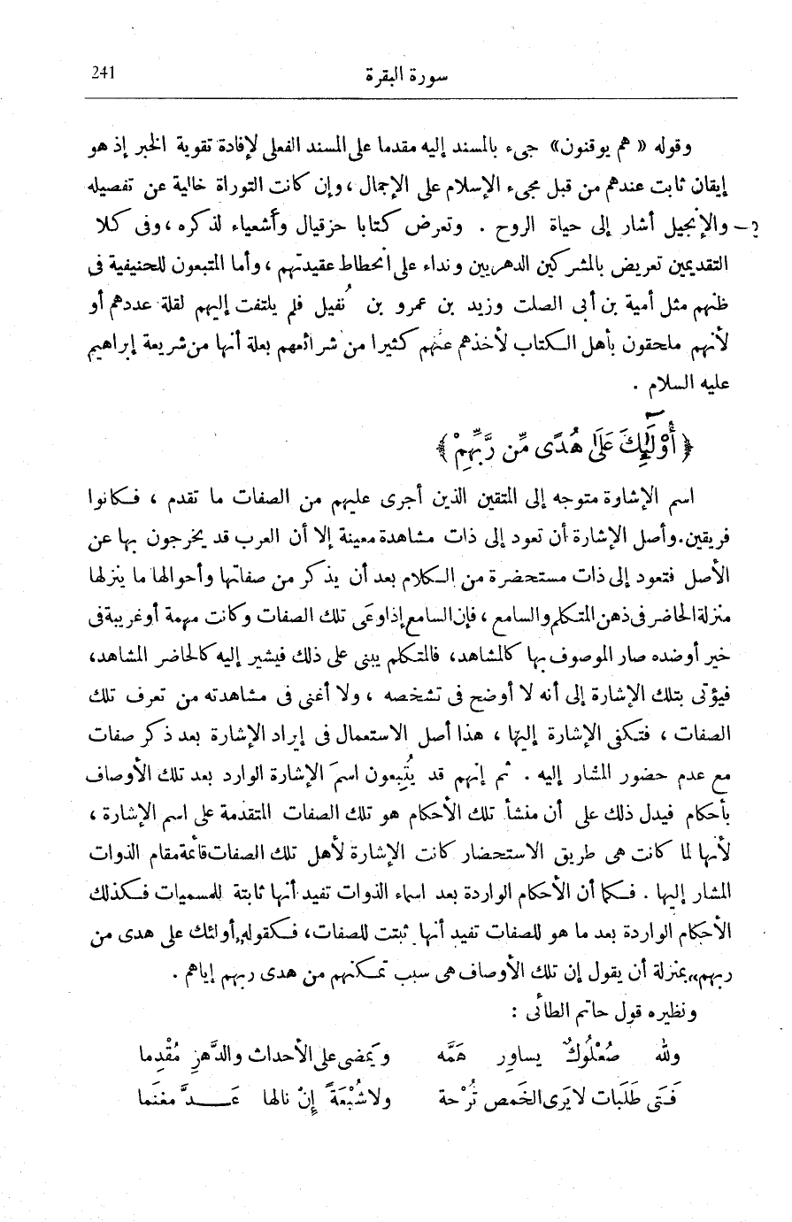 اسْمُ الْإِشَارَةِ مُتَوَجّه إِلَى لِلْمُتَّقِينَ [الْبَقَرَة: 2] الَّذِينَ أُجْرِيَ عَلَيْهِمْ مِنَ الصِّفَاتِ مَا تَقَدَّمَ، فَكَانُوا فَرِيقَيْنِ. وَأَصْلُ الْإِشَارَةِ أَنْ تَعُودَ إِلَى ذَاتٍ مُشَاهَدَةٍ مُعَيَّنَةٍ إِلَّا أَنَّ الْعَرَبَ قَدْ يَخْرُجُونَ بِهَا عَنِ الْأَصْلِ فَتَعُودُ إِلَى ذَاتٍ مُسْتَحْضَرَةٍ مِنَ الْكَلَامِ بَعْدَ أَنْ يُذْكَرَ مِنْ صِفَاتِهَا وَأَحْوَالِهَا مَا يُنْزِلُهَا مَنْزِلَةَ الْحَاضِرِ فِي ذِهْنِ الْمُتَكَلِّمِ وَالسَّامِعِ، فَإِنَّ السَّامِعَ إِذَا وَعَى تِلْكَ الصِّفَاتِ وَكَانَتْ مُهِمَّةً أَوْ غَرِيبَةً فِي خَيْرٍ أَوْ ضِدِّهِ صَارَ الْمَوْصُوفُ بِهَا كَالْمَشَاهِدِ، فَالْمُتَكَلِّمُ يَبْنِي عَلَى ذَلِكَ فَيُشِيرُ إِلَيْهِ كَالْحَاضِرِ الْمُشَاهَدِ، فَيُؤْتَى بِتِلْكَ الْإِشَارَةِ إِلَى أَنَّهُ لَا أَوْضَحَ فِي تَشَخُّصِهِ، وَلَا أَغْنَى فِي مُشَاهَدَتِهِ مِنْ تَعَرُّفِ تِلْكَ الصِّفَاتِ، فَتَكْفِي الْإِشَارَةُ إِلَيْهَا، هَذَا أَصْلُ الِاسْتِعْمَالِ فِي إِيرَادِ الْإِشَارَةِ بَعْدَ ذِكْرِ صِفَاتٍ مَعَ عَدَمِ حُضُورِ الْمُشَارِ إِلَيْهِ. ثُمَّ إِنَّهُمْ قَدْ يُتْبِعُونَ اسْمَ الْإِشَارَةِ الْوَارِدَ بَعْدَ تِلْكَ الْأَوْصَافِ بِأَحْكَامٍ فَيَدُلُّ ذَلِكَ عَلَى أَنَّ مَنْشَأَ تِلْكَ الْأَحْكَامِ هُوَ تِلْكَ الصِّفَاتِ الْمُتَقَدِّمَةِ عَلَى اسْمِ الْإِشَارَةِ، لِأَنَّهَا لَمَّا كَانَتْ هِيَ طَرِيقَ الِاسْتِحْضَارِ كَانَتِ الْإِشَارَةُ لِأَهْلِ تِلْكَ الصِّفَاتِ قَائِمَةً مَقَامَ الذَّوَاتِ الْمُشَارِ إِلَيْهَا، فَكَمَا أَنَّ الْأَحْكَامَ الْوَارِدَةَ بَعْدَ أَسْمَاءِ الذَّوَاتِ تُفِيدُ أَنَّهَا ثَابِتَةً لِلْمُسَمَّيَاتِ فَكَذَلِكَ الْأَحْكَامُ الْوَارِدَةُ بَعْدَ مَا هُوَ لِلصِّفَاتِ تُفِيدُ أَنَّهَا ثَبَتَتْ لِلصِّفَاتِ، فَكَقَوْلِهِ: أُولئِكَ عَلى هُدىً مِنْ رَبِّهِمْ بِمَنْزِلَةِ أَنْ يَقُولَ إِنَّ تِلْكَ الْأَوْصَافَ هِيَ سَبَبُ تَمَكُّنِهِمْ مِنْ هَدْيِ رَبِّهِمْ إِيَّاهُمْ. وَنَظِيرُهُ قَوْلُ حَاتِمٍ الطَّائِيِّ: