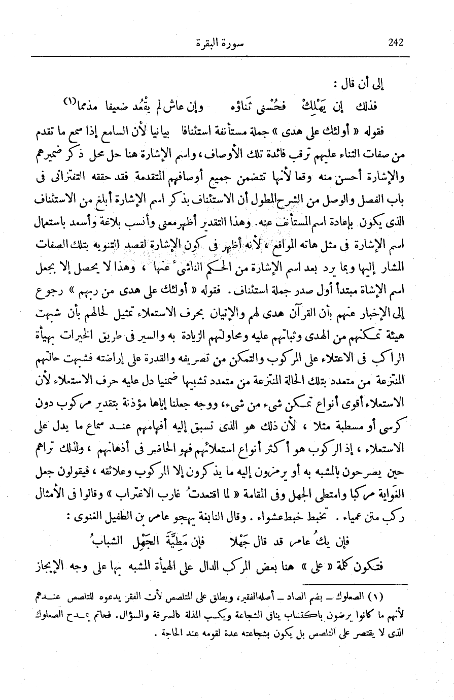 أُولئِكَ عَلى هُدىً مِنْ رَبِّهِمْ رُجُوعٌ إِلَى الْإِخْبَارِ عَنْهُمْ بِأَنَّ الْقُرْآنَ هُدًى لَهُمْ وَالْإِتْيَانُ بِحَرْفِ الِاسْتِعْلَاءِ تَمْثِيلٌ لِحَالِهِمْ بِأَنْ شُبِّهَتْ هَيْئَةُ تَمَكُّنِهِمْ مِنَ الْهُدَى وَثَبَاتِهِمْ عَلَيْهِ وَمُحَاوَلَتِهِمُ الزِّيَادَةَ بِهِ وَالسَّيْرِ فِي طَرِيقِ الْخَيْرَاتِ بِهَيْأَةِ الرَّاكِبِ فِي الِاعْتِلَاءِ عَلَى الْمَرْكُوبِ وَالتَّمَكُّنِ مِنْ تَصْرِيفِهِ وَالْقُدْرَةِ عَلَى إِرَاضَتِهِ فَشُبِّهَتْ حَالَتُهُمُ الْمُنْتَزَعَةُ مِنْ مُتَعَدِّدٍ بِتِلْكَ الْحَالَةِ الْمُنْتَزَعَةِ مِنْ مُتَعَدِّدٍ تَشْبِيهًا ضِمْنِيًّا دَلَّ عَلَيْهِ حَرْفُ الِاسْتِعْلَاءِ لِأَنَّ الِاسْتِعْلَاءَ أَقْوَى أَنْوَاعِ تَمَكُّنِ شَيْءٍ مِنْ شَيْءٍ، وَوَجْهُ جَعْلِنَا إِيَّاهَا مُؤْذِنَةً بِتَقْدِيرِ مَرْكُوبٍ دُونَ كُرْسِيٍّ أَوْ مَسْطَبَةٍ مَثَلًا، لِأَنَّ ذَلِكَ هُوَ الَّذِي تَسْبِقُ إِلَيْهِ أَفْهَامُهُمْ عِنْدَ سَمَاعِ مَا يَدُلُّ عَلَى الِاسْتِعْلَاءِ، إِذِ الرُّكُوبُ هُوَ أَكْثَرُ أَنْوَاعِ اسْتِعْلَائِهِمْ فَهُوَ الْحَاضِرُ فِي أَذْهَانِهِمْ، وَلِذَلِكَ تَرَاهُمْ حِينَ يُصَرِّحُونَ بِالْمُشَبَّهِ بِهِ أَوْ يَرْمُزُونَ إِلَيْهِ مَا يَذْكُرُونَ إِلَّا الْمَرْكُوبَ وَعَلَائِقَهُ، فَيَقُولُونَ جَعَلَ الْغِوَايَةَ مَرْكَبًا وَامْتَطَى الْجَهْلَ وَفِي «الْمَقَامَةِ» : «لِمَا اقْتَعَدَتْ غَارِبُ الِاغْتِرَابِ وَقَالُوا فِي الْأَمْثَالِ: رَكِبَ مَتْنَ عَمْيَاءَ، تَخَبَّطَ خَبْطَ عَشْوَاءَ. وَقَالَ النَّابِغَةُ يَهْجُو عَامِرَ بْنَ الطُّفَيْلِ الْغَنَوِيَّ: