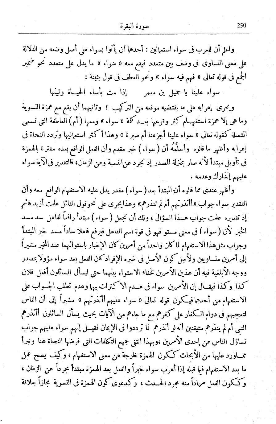 سَواءٌ عَلَيْهِمْ أَأَنْذَرْتَهُمْ مُشِيرًا إِلَى أَنَّ النَّاسَ لِتَعَجُّبِهِمْ فِي دَوَامِ الْكُفَّارِ عَلَى كُفْرِهِمْ مَعَ مَا جَاءَهُمْ مِنَ الْآيَاتِ بِحَيْثُ يَسْأَلُ السَّائِلُونَ أَأَنْذَرَهُمُ النَّبِيُّ أَمْ لَمْ يُنْذِرْهُمْ مُتَيَقِّنِينَ أَنَّهُ لَوْ أَنْذَرَهُمْ لَمَا تَرَدَّدُوا فِي الْإِيمَانِ فَقِيلَ إِنَّهُمْ سَوَاءٌ عَلَيْهِمْ جَوَابُ تَسَاؤُلِ النَّاسِ عَنْ إِحْدَى الْأَمْرَيْنِ، وَبِهَذَا انْتَفَى جَمِيعُ التَّكَلُّفَاتِ الَّتِي فَرَضَهَا النُّحَاةُ هُنَا وَنَبْرَأُ مِمَّا وَرَدَ عَلَيْهَا مِنَ الْأَبْحَاثِ كَكَوْنِ الْهَمْزَةِ خَارِجَةً عَنْ مَعْنَى الِاسْتِفْهَامِ، وَكَيْفَ يَصِحُّ عَمَلَ مَا بَعْدَ الِاسْتِفْهَامِ فِيمَا قَبْلَهُ إِذَا أُعْرِبَ (سَوَاءٌ) خَبَرًا وَالْفِعْلُ بَعْدَ الْهَمْزَةِ مُبْتَدَأً مُجَرَّدًا عَنِ الزَّمَانِ، وَكَكَوْنِ الْفِعْلِ مُرَادًا مِنْهُ مُجَرَّدُ الْحَدَثِ، وَكَدَعْوَى كَوْنِ الْهَمْزَةِ فِي التَّسْوِيَةِ مَجَازًا بِعَلَاقَةِ