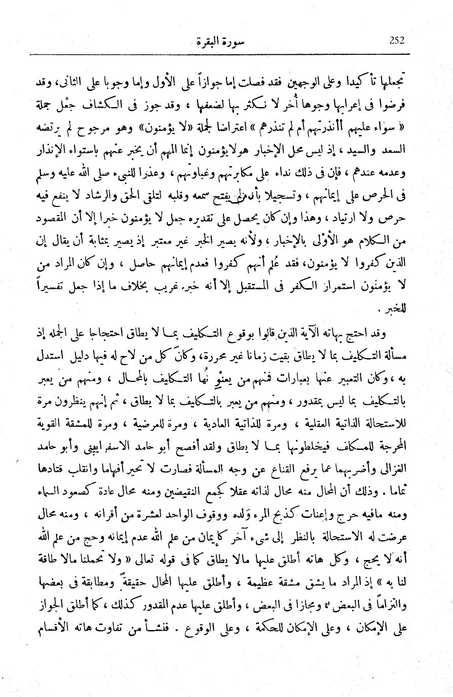 وَقَدِ احْتَجَّ بِهَاتِهِ الْآيَةِ الَّذِينَ قَالُوا بِوُقُوعِ التَّكْلِيفِ بِمَا لَا يُطَاقُ احْتِجَاجًا عَلَى الْجُمْلَةِ إِذْ مَسْأَلَةُ التَّكْلِيفِ بِمَا لَا يُطَاقُ بَقِيَتْ زَمَانًا غَيْرَ مُحَرَّرَةٍ، وَكَانَ كُلُّ مَنْ لَاحَ لَهُ فِيهَا دَلِيلٌ اسْتَدَلَّ بِهِ، وَكَانَ التَّعْبِيرُ عَنْهَا بِعِبَارَاتٍ فَمِنْهُمْ مَنْ يُعَنْوِنُهَا التَّكْلِيفَ بِالْمُحَالِ، وَمِنْهُمْ مَنْ يُعَبِّرُ بِالتَّكْلِيفِ بِمَا لَيْسَ بِمَقْدُورٍ، وَمِنْهُمْ مَنْ يُعَبِّرُ بِالتَّكْلِيفِ بِمَا لَا يُطَاقُ، ثُمَّ إِنَّهُمْ يَنْظُرُونَ مَرَّةً لِلِاسْتِحَالَةِ الذَّاتِيَّةِ الْعَقْلِيَّةِ، وَمَرَّةً لِلذَّاتِيَّةِ الْعَادِيَّةِ، وَمَرَّةً لِلْعَرَضِيَّةِ، وَمَرَّةً لِلْمَشَقَّةِ الْقَوِيَّةِ الْمُحْرِجَةِ لِلْمُكَلَّفِ فَيَخْلِطُونَهَا بِمَا لَا يُطَاقُ وَلَقَدْ أَفْصَحَ أَبُو حَامِدٍ الْإِسْفَرَايِينِيُّ وَأَبُو حَامِدٍ الْغَزَالِيُّ وَأَضْرَابُهُمَا عَمَّا يَرْفَعُ الْقِنَاعَ عَنْ وَجْهِ الْمَسْأَلَةِ فَصَارَتْ لَا تُحَيِّرُ أَفْهَامًا وَانْقَلَبَ قَتَادُهَا ثُمَامًا، وَذَلِكَ أَنَّ الْمُحَالَ مِنْهُ مُحَالٌ لِذَاتِهِ عَقْلًا كَجَمْعِ النَّقِيضَيْنِ وَمِنْهُ مُحَالٌ عَادَةً كَصُعُودِ السَّمَاءِ وَمِنْهُ مَا فِيهِ حَرَجٌ وَإِعْنَاتٌ كَذَبْحِ الْمَرْءِ وَلَدَهُ وَوُقُوفِ الْوَاحِدِ لِعَشَرَةٍ مِنْ أَقْرَانِهِ، وَمِنْهُ مَحَالٌ عَرَضَتْ لَهُ الِاسْتِحَالَةُ بِالنَّظَرِ إِلَى شَيْءٍ آخَرَ كَإِيمَانِ مَنْ عَلِمَ اللَّهُ عَدَمَ إِيمَانِهِ وَحَجِّ مَنْ عَلِمَ اللَّهُ أَنَّهُ لَا يَحُجُّ، وَكُلَّ هَاتِهِ أُطْلِقَ عَلَيْهَا مَا لَا يُطَاقُ كَمَا فِي قَوْلِهِ تَعَالَى: وَلا تُحَمِّلْنا مَا لَا طاقَةَ لَنا بِهِ إِذِ الْمُرَادُ مَا يَشُقُّ مَشَقَّةً عَظِيمَةً، وَأُطْلِقَ عَلَيْهَا الْمُحَالُ حَقِيقَةً وَمُطَابَقَةً فِي بَعْضِهَا وَالْتِزَامًا فِي الْبَعْضِ، وَمَجَازًا فِي الْبَعْضِ، وَأُطْلِقَ عَلَيْهَا عَدَمُ الْمَقْدُورِ كَذَلِكَ، كَمَا أُطْلِقَ الْجَوَازُ عَلَى الْإِمْكَانِ، وَعَلَى الْإِمْكَانِ لِلْحِكْمَةِ، وَعَلَى الْوُقُوعِ، فَنَشَأَ مِنْ تَفَاوُتِ هَاتِهِ الْأَقْسَامِ