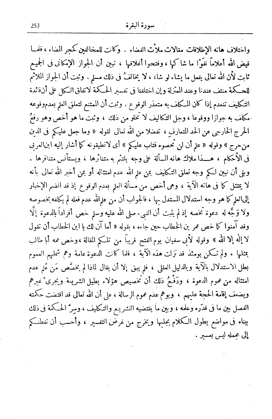 وَاخْتِلَافِ هَاتِهِ الْإِطْلَاقَاتِ مَقَالَاتٌ مَلَأَتِ الْفَضَاءَ، وَكَانَتْ لِلْمُخَالِفِينَ كَحَجَرِ الْمَضَاءِ، فَلَمَّا قَيَّضَ اللَّهُ أَعْلَامًا نَفَوْا مَا شَاكَهَا، وَفَتَحُوا أَغْلَاقَهَا، تَبَيَّنَ أَنَّ الْجَوَازَ الْإِمْكَانِيَّ فِي الْجَمِيعِ ثَابِتٌ لِأَنَّ اللَّهَ تَعَالَى يَفْعَلُ مَا يَشَاءُ لَوْ شَاءَ، لَا يُخَالِفُ فِي ذَلِكَ مُسْلِمٌ. وَثَبَتَ أَنَّ الْجَوَازَ الْمُلَائِمَ لِلْحِكْمَةِ مُنْتَفٍ عِنْدَنَا وَعِنْدَ الْمُعْتَزِلَةِ وَإِنِ اخْتَلَفْنَا فِي تَفْسِيرِ الْحِكْمَةِ لِاتِّفَاقِ الْكُلِّ عَلَى أَنَّ فَائِدَةَ التَّكْلِيفِ تَنْعَدِمُ إِذَا كَانَ الْمُكَلَّفُ بِهِ مُتَعَذَّرَ الْوُقُوعِ. وَثَبَتَ أَنَّ الْمُمْتَنِعَ لِتَعَلُّقِ الْعِلْمِ بِعَدَمِ وُقُوعِهِ مُكَلَّفٌ بِهِ جَوَازًا وَوُقُوعًا، وَجُلُّ التَّكَالِيفِ لَا تَخْلُو مِنْ ذَلِكَ، وَثَبَتَ مَا هُوَ أَخَصُّ وَهُوَ رَفْعُ الْحَرَجِ الْخَارِجِيِّ عَنِ الْحَدِّ الْمُتَعَارَفِ، تُفَضُّلًا مِنَ اللَّهِ لِقَوْلِهِ: وَما جَعَلَ عَلَيْكُمْ فِي الدِّينِ مِنْ حَرَجٍ [الْحَج: 78] وَقَوْلِهِ: