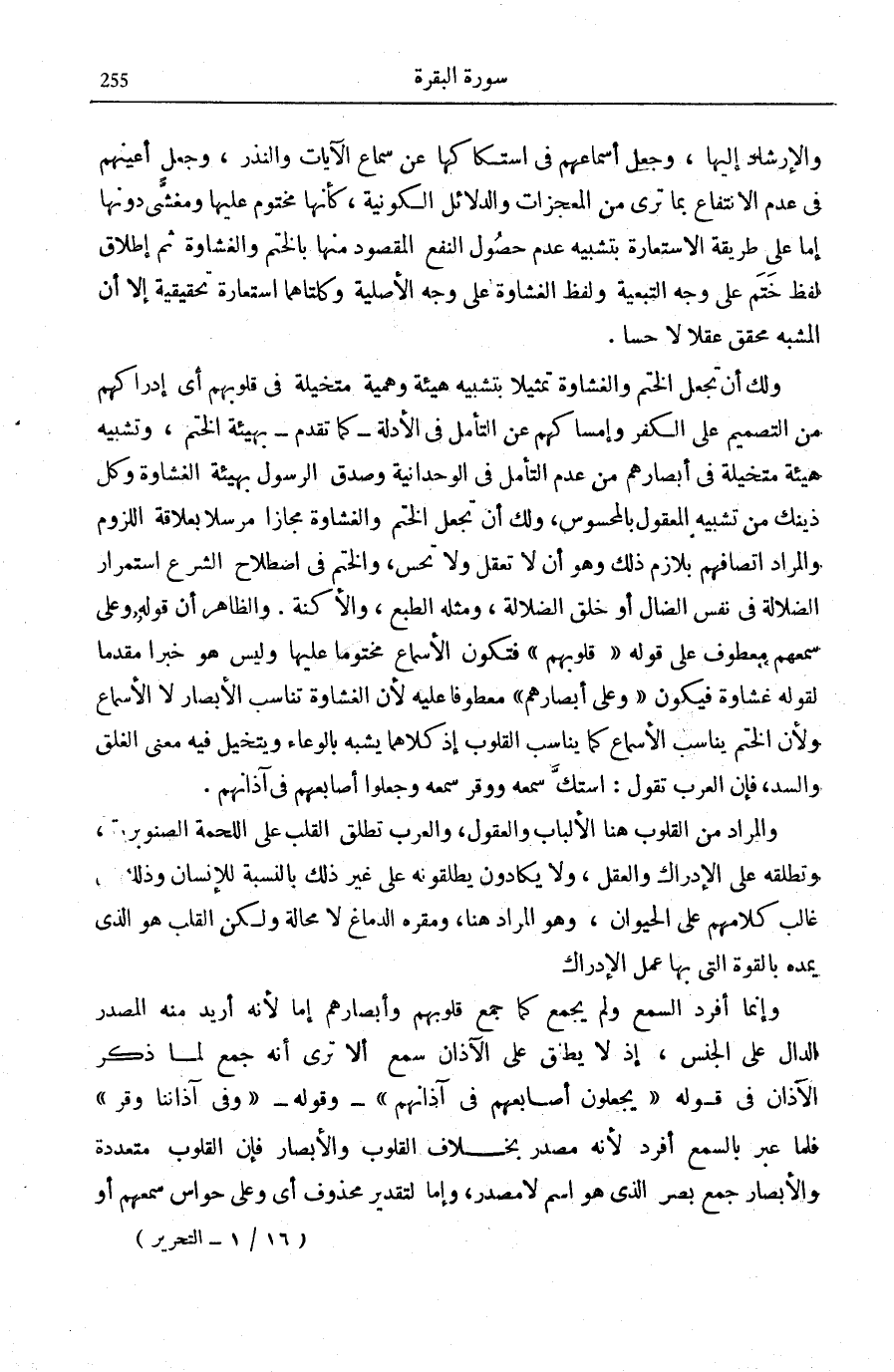 وَالْإِرْشَادِ إِلَيْهَا، وَجَعْلِ أَسْمَاعِهِمْ فِي اسْتِكَاكِهَا عَنْ سَمَاعِ الْآيَاتِ وَالنُّذُرِ، وَجَعْلِ أَعْيُنِهِمْ فِي عَدَمِ الِانْتِفَاعِ بِمَا تَرَى مِنَ الْمُعْجِزَاتِ وَالدَّلَائِلِ الْكَوْنِيَّةِ، كَأَنَّهَا مَخْتُومٌ عَلَيْهَا وَمَغْشِيٌّ دُونَهَا إِمَّا عَلَى طَرِيقَةِ الِاسْتِعَارَةِ بِتَشْبِيهِ عَدَمِ حُصُولِ النَّفْعِ الْمَقْصُودِ مِنْهَا بِالْخَتْمِ وَالْغِشَاوَةِ ثُمَّ إِطْلَاقُ لَفْظِ خَتَمَ عَلَى وَجْهِ التَّبَعِيَّةِ وَلَفْظِ الْغِشَاوَةِ عَلَى وَجْهِ الْأَصْلِيَّةِ وَكِلْتَاهُمَا اسْتِعَارَةٌ تَحْقِيقِيَّةٌ إِلَّا أَنَّ الْمُشَبَّهَ مُحَقَّقٌ عَقْلًا لَا حِسًّا. وَلَكَ أَنْ تَجْعَلَ الْخَتْمَ وَالْغِشَاوَةَ تَمْثِيلًا بِتَشْبِيهِ هَيْئَةٍ وَهْمِيَّةٍ مُتَخَيَّلَةٍ فِي قُلُوبِهِمْ أَيْ إِدْرَاكِهِمْ مِنَ التَّصْمِيمِ عَلَى الْكُفْرِ وَإِمْسَاكِهِمْ عَنِ التَّأَمُّلِ فِي الْأَدِلَّةِ- كَمَا تَقَدَّمَ- بِهَيْئَةِ الْخَتْمِ، وَتَشْبِيهِ هَيْئَةٍ مُتَخَيَّلَةٍ فِي أَبْصَارِهِمْ مِنْ عَدَمِ التَّأَمُّلِ فِي الْوَحْدَانِيَّةِ وَصِدْقِ الرَّسُولِ بِهَيْئَةِ الْغِشَاوَةِ وَكُلُّ ذَيْنَكَ مِنْ تَشْبِيهِ الْمَعْقُولِ بِالْمَحْسُوسِ، وَلَكَ أَنْ تَجْعَلَ الْخَتْمَ وَالْغِشَاوَةَ مَجَازًا مُرْسَلًا بِعَلَاقَةِ اللُّزُومِ وَالْمُرَادُ اتِّصَافُهُمْ بِلَازِمِ ذَلِكَ وَهُوَ أَنْ لَا تَعْقِلَ وَلَا تَحُسَّ، وَالْخَتْمُ فِي اصْطِلَاحِ الشَّرْعِ اسْتِمْرَارُ الضَّلَالَةِ فِي نَفْسِ الضَّالِّ أَوْ خُلُقُ الضَّلَالَةِ، وَمِثْلُهُ الطَّبْعُ، وَالْأَكِنَّةُ.
