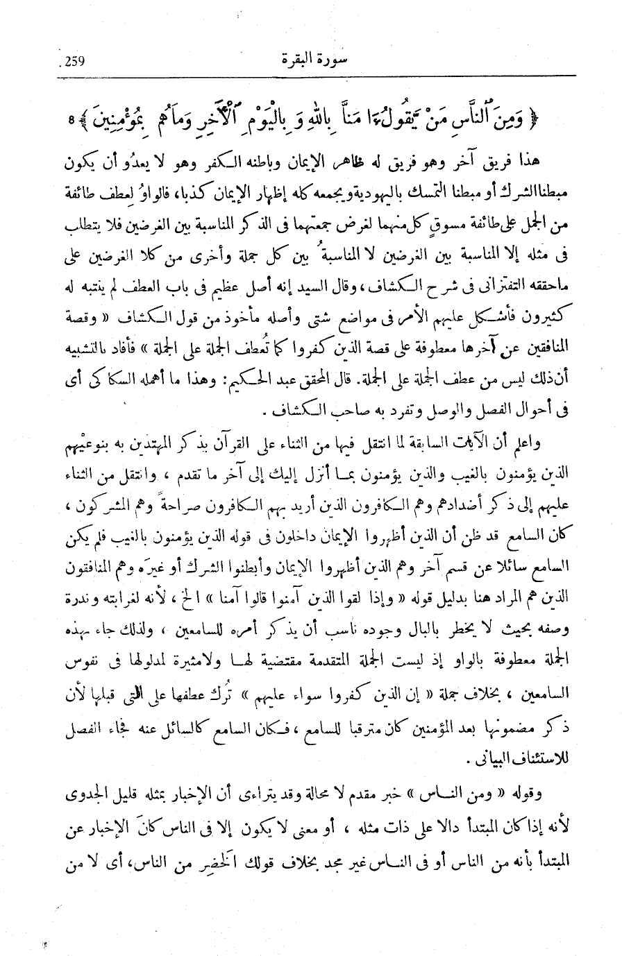 هَذَا فَرِيقٌ آخَرُ وَهُوَ فَرِيقٌ لَهُ ظَاهِرُ الْإِيمَانِ وَبَاطِنُهُ الْكُفْرُ وَهُوَ لَا يعدو أَنْ يَكُونَ مُبْطِنًا الشِّرْكَ أَوْ مُبْطِنًا التَّمَسُّكَ بِالْيَهُودِيَّةِ وَيَجْمَعُهُ كُلُّهُ إِظْهَارُ الْإِيمَانِ كَذِبًا، فَالْوَاوُ لِعَطْفِ طَائِفَةٍ مِنَ الْجُمَلِ عَلَى طَائِفَةٍ مَسُوقٍ كُلٍّ مِنْهُمَا لِغَرَضٍ جَمَعَتْهُمَا فِي الذِّكْرِ الْمُنَاسَبَةُ بَيْنَ الْغَرَضَيْنِ فَلَا يُتَطَلَّبُ فِي مِثْلِهِ إِلَّا الْمُنَاسَبَةُ بَيْنَ الْغَرَضَيْنِ لَا الْمُنَاسَبَةُ بَيْنَ كُلِّ جُمْلَةٍ وَأُخْرَى مِنْ كِلَا الْغَرَضَيْنِ عَلَى مَا حَقَّقَهُ التفتازانيّ فِي شَرْحِ الْكَشَّافِ، وَقَالَ السَّيِّدُ إِنَّهُ أَصْلٌ عَظِيمٌ فِي بَابِ الْعَطْفِ لَمْ يَنْتَبِهْ لَهُ كَثِيرُونَ فَأَشْكَلَ عَلَيْهِمُ الْأَمْرُ فِي مَوَاضِعَ شَتَّى وَأَصْلُهُ مَأْخُوذٌ مِنْ قَوْلِ «الْكَشَّافِ» : «وَقِصَّةُ الْمُنَافِقِينَ عَنْ آخِرِهَا مَعْطُوفَةٌ عَلَى قِصَّةِ الَّذِينَ كَفَرُوا [الْبَقَرَة: 6] كَمَا تُعْطَفُ الْجُمْلَةُ عَلَى الْجُمْلَةِ» فَأَفَادَ بِالتَّشْبِيهِ أَنَّ ذَلِكَ لَيْسَ مِنْ عَطْفِ الْجُمْلَةِ عَلَى الْجُمْلَةِ.