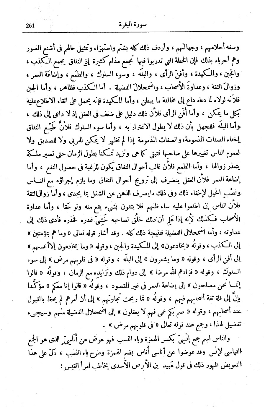 9] إِلَى الْمَكِيدَةِ وَالْجُبْنِ، وَقَوله: مَا يَخْدَعُونَ إِلَّا أَنْفُسَهُمْ [الْبَقَرَة: 9] إِلَى أَفَنِ الرَّأْيِ، وَقَوْلُهُ: وَما يَشْعُرُونَ [الْبَقَرَة: 9] إِلَى الْبَلَهِ، وَقَوْلُهُ: فِي قُلُوبِهِمْ مَرَضٌ [الْبَقَرَة: 10] إِلَى سُوءِ السُّلُوكِ، وَقَوْلُهُ: فَزادَهُمُ اللَّهُ مَرَضاً [الْبَقَرَة: 10] إِلَى دَوَامِ ذَلِكَ وَتَزَايُدِهِ مَعَ الزَّمَانِ، وَقَوْلُهُ: قالُوا إِنَّما نَحْنُ مُصْلِحُونَ [الْبَقَرَة: 11] إِلَى إِضَاعَةِ الْعُمُرِ فِي غَيْرِ الْمَقْصُودِ، وَقَوْلُهُ: