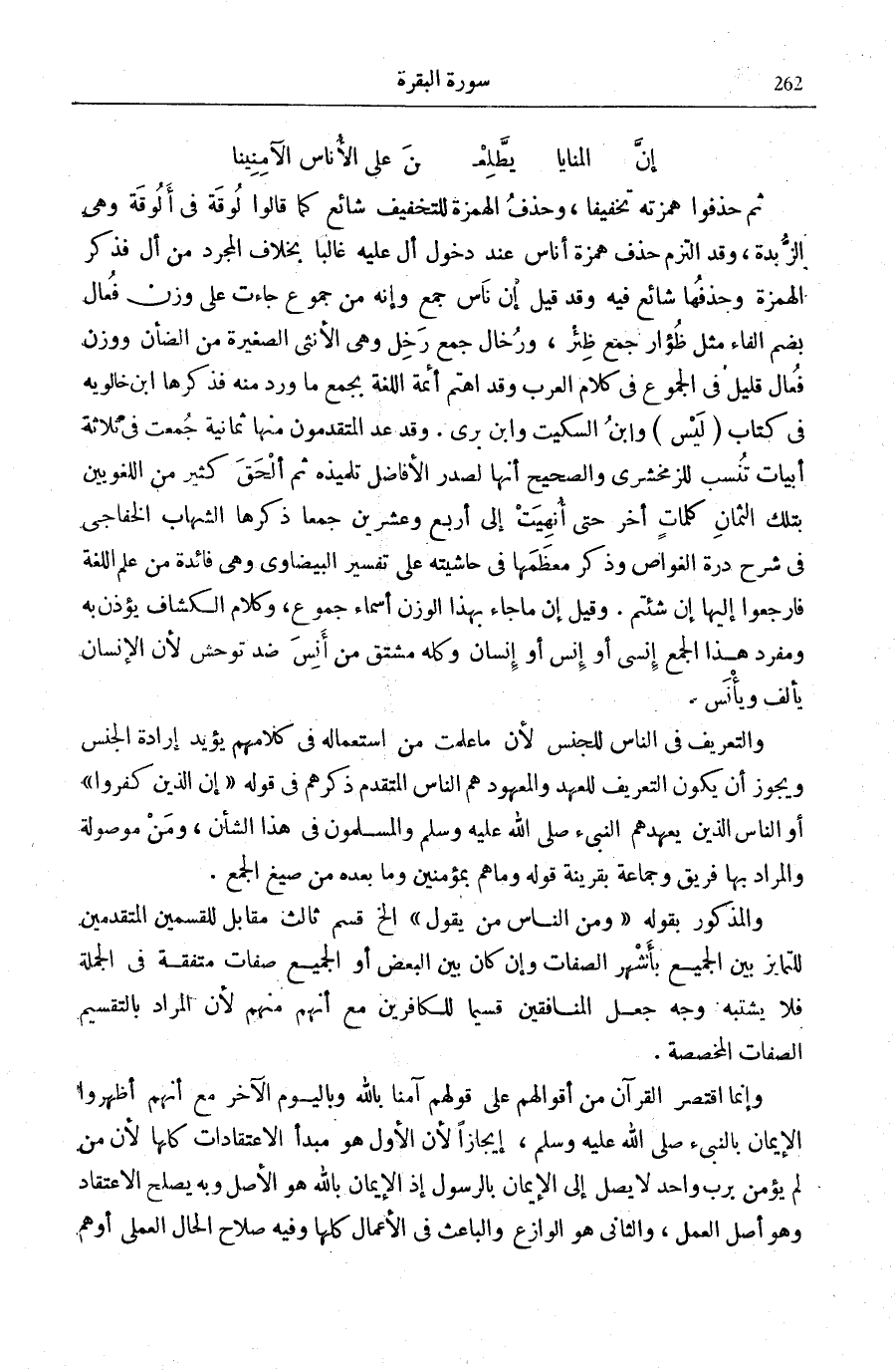 وَالتَّعْرِيفُ فِي النَّاسِ لِلْجِنْسِ لِأَنَّ مَا عَلِمْتُ مِنَ اسْتِعْمَالِهِ فِي كَلَامِهِمْ يُؤَيِّدُ إِرَادَةَ الْجِنْسِ وَيَجُوزُ أَنْ يَكُونَ التَّعْرِيفُ لِلْعَهْدِ وَالْمَعْهُودُ هُمُ النَّاسُ الْمُتَقَدِّمُ ذِكْرُهُمْ فِي قَوْلِهِ: إِنَّ الَّذِينَ كَفَرُوا [الْبَقَرَة: 6] أَوِ النَّاسِ الَّذِينَ يَعْهَدُهُمُ النَّبِيءُ صَلَّى اللهُ عَلَيْهِ وَسَلَّمَ وَالْمُسْلِمُونَ فِي هَذَا الشَّأْنِ، وَ (مَنْ) مَوْصُولَةٌ وَالْمُرَادُ بِهَا فَرِيقٌ وَجَمَاعَةٌ بِقَرِينَةِ قَوْلِهِ وَما هُمْ بِمُؤْمِنِينَ