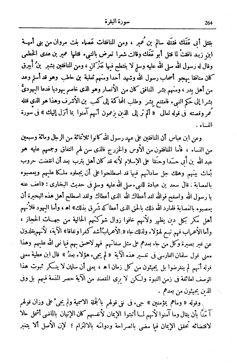 ، وَمِنَ الْمُنَافِقِينَ بَشِيرُ بْنُ أُبَيْرِقٍ كَانَ مُنَافِقًا يَهْجُو أَصْحَابَ رَسُولِ اللَّهِ وَشَهِدَ أُحُدًا وَمِنْهُمْ ثَعْلَبَةُ بْنُ حَاطِبٍ وَهُوَ قَدْ أَسْلَمَ وَعُدَّ مِنْ أَهْلِ بَدْرٍ، وَمِنْهُمْ بِشْرُ الْمُنَافِقُ كَانَ مِنَ الْأَنْصَارِ وَهُوَ الَّذِي خَاصَمَ يَهُودِيَّا فَدَعَا الْيَهُودِيُّ بِشْرًا إِلَى حُكْمِ النَّبِيءِ فَامْتَنَعَ بِشْرٌ وَطَلَبَ الْمُحَاكَمَةَ إِلَى كَعْبِ بْنِ الْأَشْرَفِ وَهَذَا هُوَ الَّذِي قَتَلَهُ عُمَرُ وَقِصَّتُهُ فِي قَوْلِهِ تَعَالَى: أَلَمْ تَرَ إِلَى الَّذِينَ يَزْعُمُونَ أَنَّهُمْ آمَنُوا بِما أُنْزِلَ إِلَيْكَ فِي سُورَةِ النِّسَاءِ [60] . وَعَنِ ابْنِ عَبَّاسٍ أَنَّ الْمُنَافِقِينَ عَلَى عَهْدِ رَسُولِ اللَّهِ كَانُوا ثَلَاثَمِائَةٍ مِنَ الرِّجَالِ وَمِائَةً وَسَبْعِينَ مِنَ النِّسَاءِ، فَأَمَّا الْمُنَافِقُونَ مِنَ الْأَوْسِ وَالْخَزْرَجِ فَالَّذِي سَنَّ لَهُمُ النِّفَاقَ وَجَمَعَهُمْ عَلَيْهِ هُوَ عَبْدُ اللَّهِ بْنُ أُبَيٍّ حَسَدًا وَحَنَقًا عَلَى الْإِسْلَامِ لِأَنَّهُ قَدْ كَانَ أَهْلُ يَثْرِبَ بَعْدَ أَنِ انْقَضَتْ حُرُوبُ بُعَاثٍ بَيْنَهُمْ وَهَلَكَ جُلُّ سَادَاتِهِمْ فِيهَا قَدِ اصْطَلَحُوا عَلَى أَنْ يَجْعَلُوهُ مَلِكًا عَلَيْهِمْ وَيُعَصِّبُوهُ بِالْعِصَابَةِ.