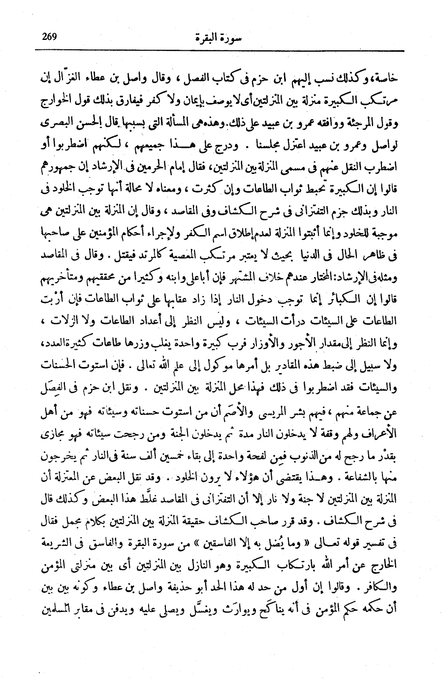 عَلَى ذَلِكَ. وَهَذِهِ هِيَ الْمَسْأَلَةُ الَّتِي بِسَبَبِهَا قَالَ الْحَسَنُ الْبَصْرِيُّ لِوَاصِلٍ وَعَمْرِو بْنِ عُبَيْدٍ اعْتَزَلَ مَجْلِسَنَا. وَدَرَجَ عَلَى هَذَا جَمِيعُهُمْ، لَكِنَّهُمُ اضْطَرَبُوا أَوِ اضْطَرَبَ النَّقْلُ عَنْهُمْ فِي مُسَمَّى الْمَنْزِلَةِ بَيْنَ الْمَنْزِلَتَيْنِ، فَقَالَ إِمَامُ الْحَرَمَيْنِ فِي «الْإِرْشَاد» إِن جُمْهُور هم قَالُوا إِنَّ الْكَبِيرَةَ تُحْبِطُ ثَوَابَ الطَّاعَاتِ وَإِنْ كَثُرَتْ، وَمَعْنَاهُ لَا مَحَالَةَ أَنَّهَا تُوجِبُ الْخُلُودَ فِي النَّارِ وَبِذَلِك جزم التفتازانيّ فِي «شَرْحِ الْكَشَّافِ» وَفِي «الْمَقَاصِدِ» ، وَقَالَ إِنَّ الْمَنْزِلَةَ بَيْنَ الْمَنْزِلَتَيْنِ هِيَ مُوجِبَةٌ لِلْخُلُودِ وَإِنَّمَا أَثْبَتُوا الْمَنْزِلَةَ لِعَدَمِ إِطْلَاقِ اسْمِ الْكُفْرِ وَلِإِجْرَاءِ أَحْكَامِ الْمُؤْمِنِينَ عَلَى صَاحِبِهَا فِي ظَاهِرِ الْحَالِ فِي الدُّنْيَا بِحَيْثُ لَا يُعْتَبَرُ مُرْتَكِبُ الْمَعْصِيَةِ كَالْمُرْتَدِّ فَيُقْتَلُ.